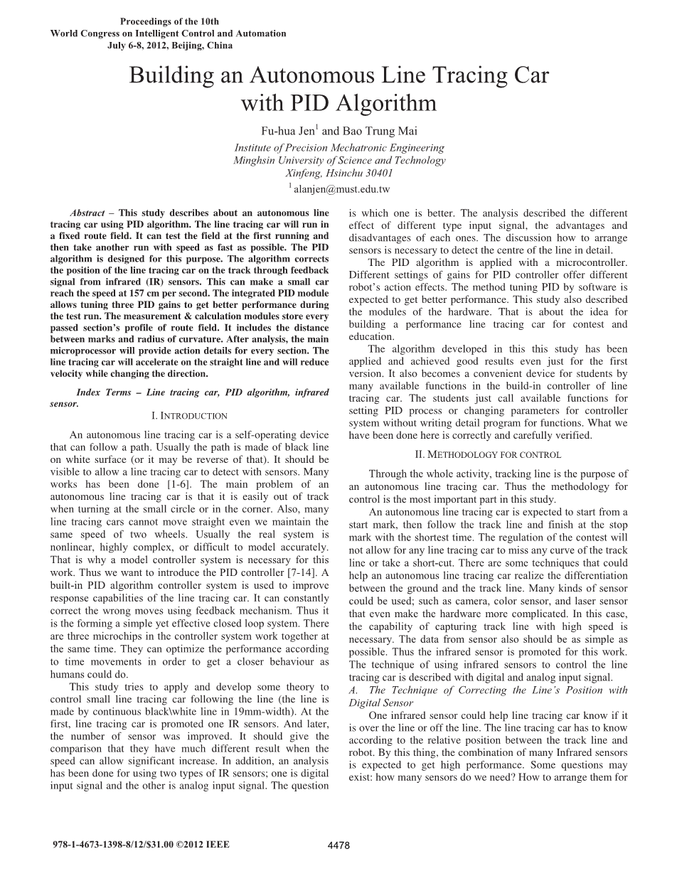 这项研究描述了使用PID算法设计自动循迹小车。这个寻迹小车将在一个领域的固定路线上运行。它能够在第一次运行时测试该字段然后以尽可能快的速度进行另一次运行。PID算法就是为此目的而设计的。这个算法通过来自红外传感器的反馈信号纠正在轨道上的循迹小车的位置。 这可以使小车达到每秒157厘米的速度。集成的PID模块允许调整三个PID增益,以在测试运行期间获得更好的性能。测量和计算模块存储路径字段的每个传递部分的配置文件。它包括标记和曲率半径之间的距离。经过分析,主微处理器将为每个部分提供操作细节。这个循迹小车将在直线上加速并在改变方向时降低速度。