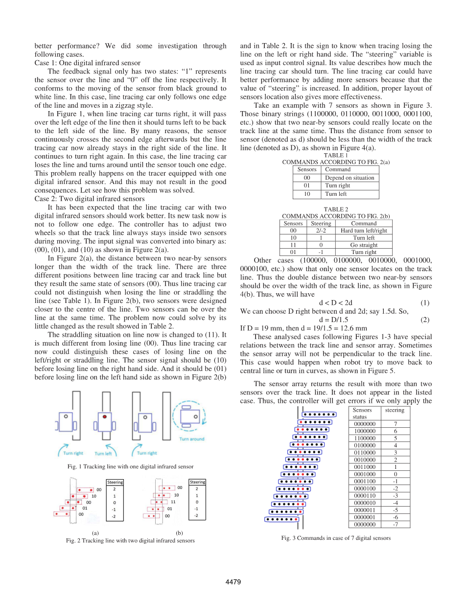 其他情况(100000,0100000,0010000,0001000,0000100等)表明只有一个传感器位于轨道线上。因此,两个附近传感器之间的双倍距离应该超过轨道线的宽度,如图4(b)所示。因此,我们有d lt;D lt;2d(1)。我们可以在d和2d之间选择D; 说1.5d。 那么,d = D / 1.5(2)如果D = 19mm,则d = 19 / 1.5 = 12.6mm。