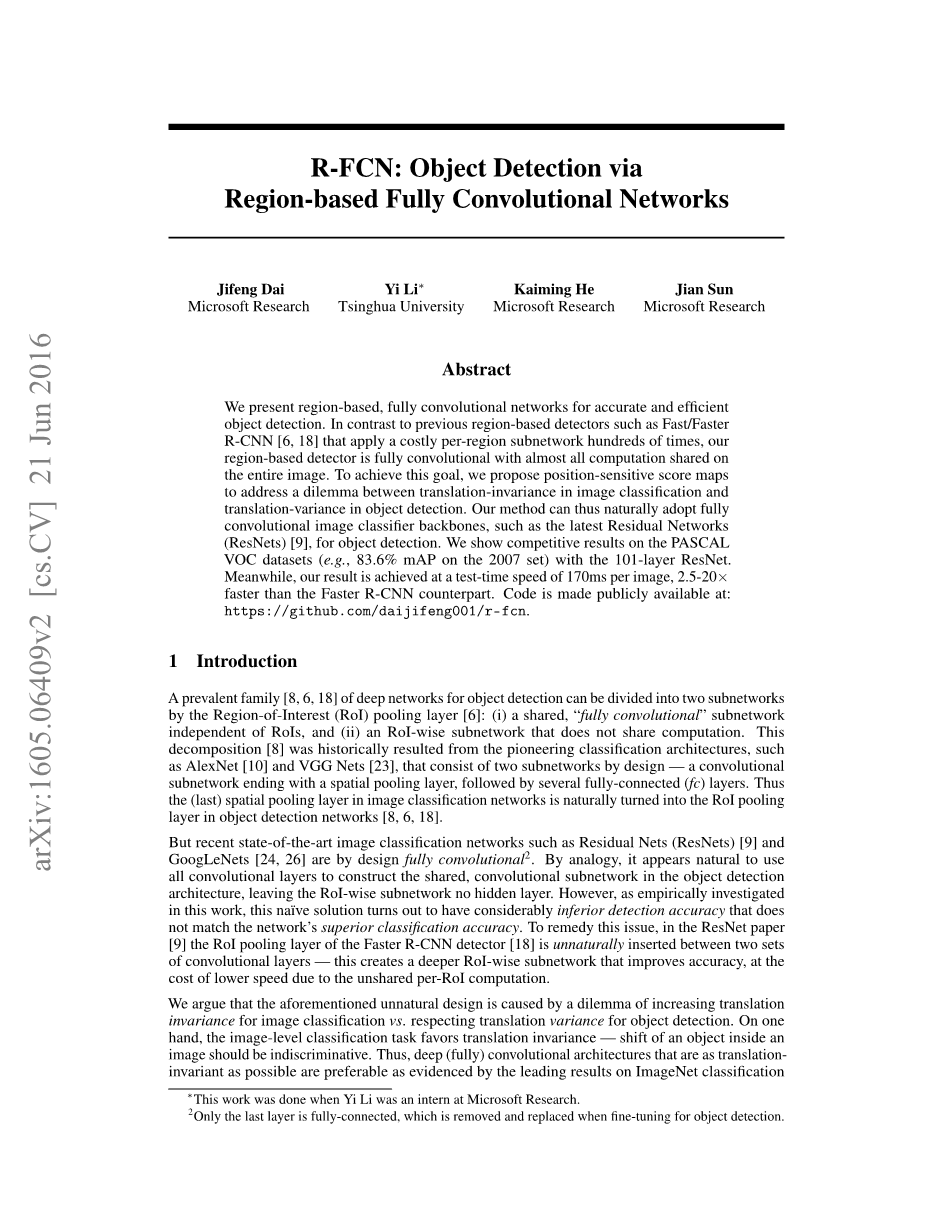 我们提出了基于区域的全卷积网络,以实现准确和有效的目标检测。与先前的基于区域的检测器相比,如快速/快速的R-CNN [6,18],其应用昂贵的每区域子网络数百次,我们的基于区域的检测器是完全卷积的,几乎所有的计算都在整个图像上共享。为了实现这一目标,我们提出位置敏感分数图来解决图像分类中的平移不变性与物体检测中的平移变异之间的两难境地。因此,我们的方法自然会采用完全卷积图像分类器骨干,如最新的残余网络(ResNets)[9],用于对象检测。我们使用101层ResNet在PASCAL VOC数据集上展示竞争结果(例如,2007年的83.6%mAP)。同时,我们的结果是在每张图像170ms的测试时间速度下实现的,比R-CNN更快的速度快2.5-20倍。代码公开发布在:https://github.com/daijifeng001/r-fcn。