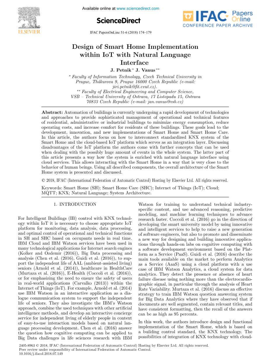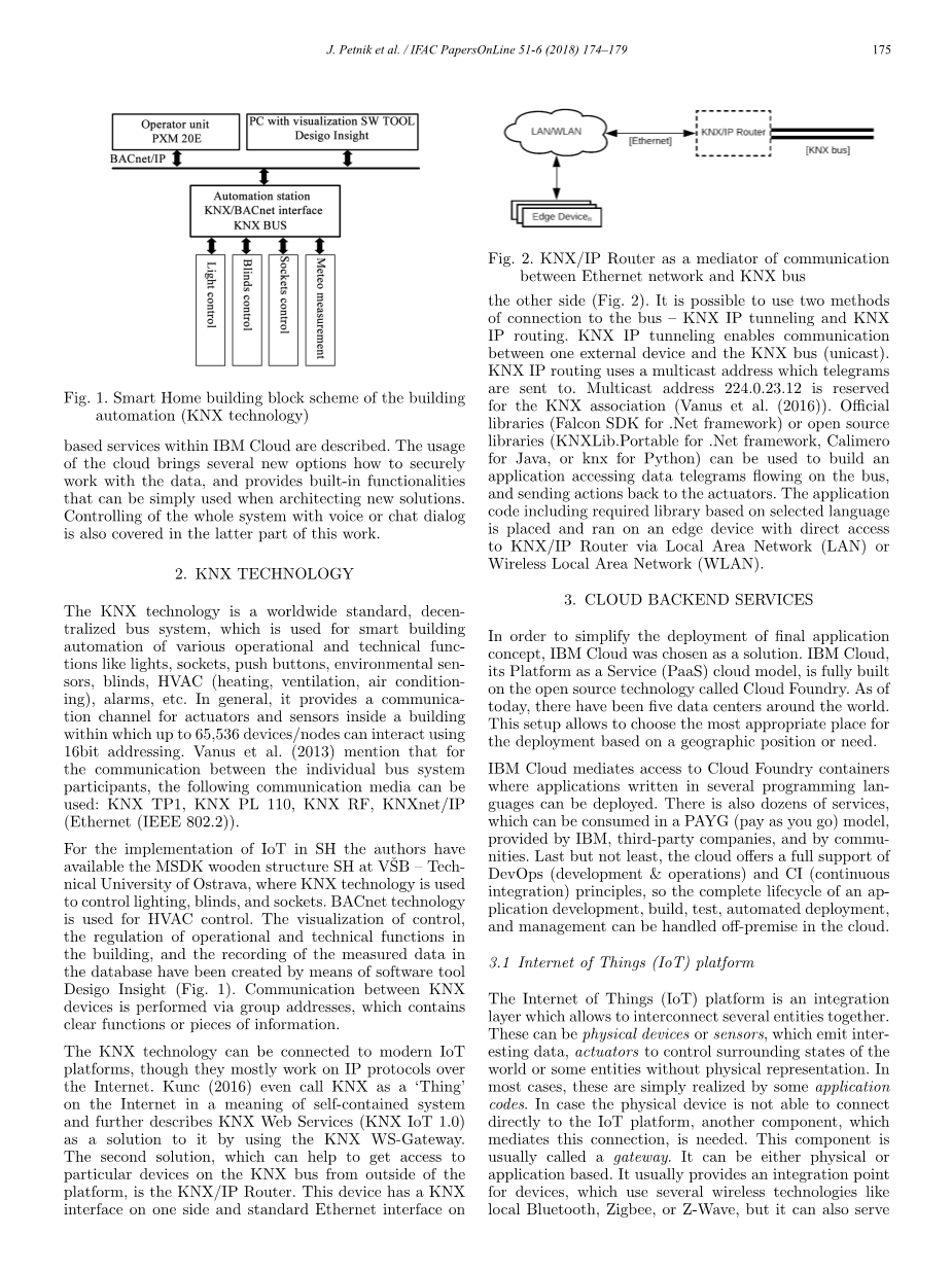 对于在SH中实现物联网,作者有可在VSB获得MSDK木结构SH - Tech-俄斯特拉发的nical大学,使用KNX技术控制照明,百叶窗和插座。BACnet技术用于HVAC控制,控制的可视化,对业务和技术职能的监管建筑物,以及测量数据的记录数据库已通过软件工具创建