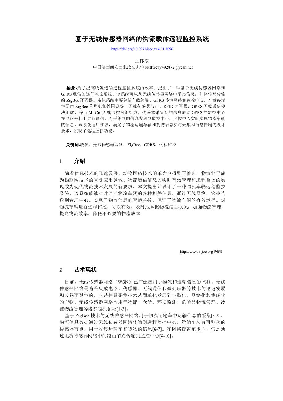 Keywords—logistics, wireless sensor network, ZigBee, GPRS, remote moni-toring