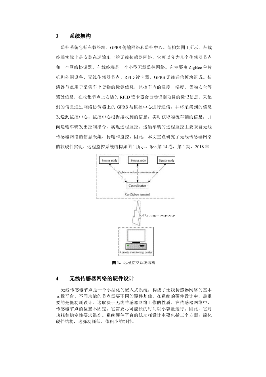 The wireless sensor network based on ZigBee technology is used to collect the transporter information in the logistics transporter[4 -5]. Through the WSN network, the logistics information data is transmitted to the remote monitoring center. The transport vehicle is equipped with a movable sensor node for collecting information of the transporter and the goods[6-7]. Within the coverage of the network, infor-mation is transmitted to the monitoring center through routing nodes in the wireless sensor network [8-10].