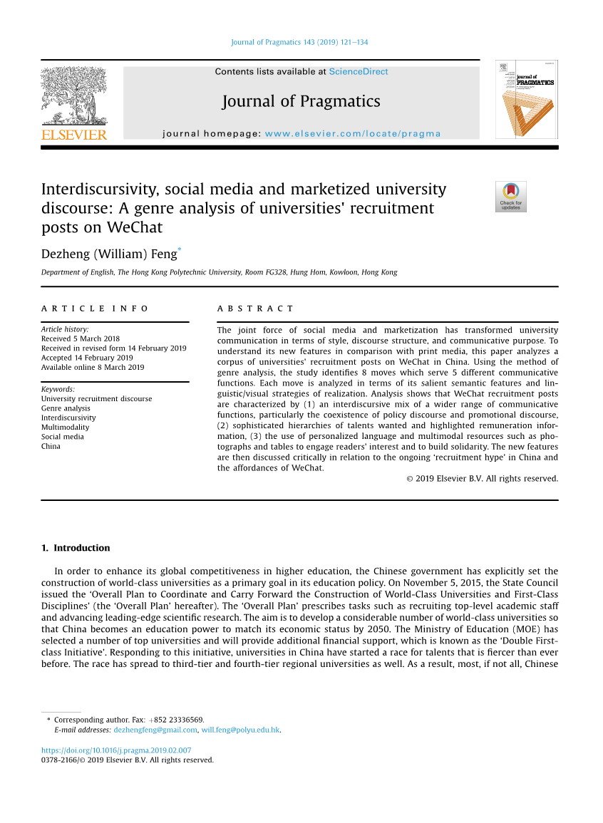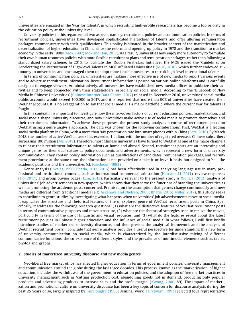流派分析(Swales, 1990;Bhatia, 2013, 2016)已被有效地用于分析许多专业和制度语境中的语言使用,如国际商事仲裁(Han and Li, 2011)、review responses (Ho, 2017)和团购页面(Lam, 2013)。与本研究特别相关的是熊(2012)对高校报纸招聘广告的分析,该分析表明,报纸招聘广告在宣传高校品牌的同时,也起到了宣传相关学术岗位的作用。假设流派不断变化,新媒体不同于传统媒体(如Askehave和Nielsen, 2005;Bhatia, 2016;Miller, 2017),本研究试图通过调查当大学的招聘广告转向社交媒体时会发生什么,为类型研究做出贡献。阐述了我国未开发的微信招聘岗位的结构和修辞特点。具体地说,它解决了以下研究问题:(1)的特色是什么微信招聘职位的交际目的和移动结构,(2)什么是修辞策略用于实现移动,特别是在语言和视觉资源的使用方面,和(3)的特性揭示了中国高等教育的最新招聘政策和社会媒体的影响。接下来,我将首先简要介绍市场化大学话语的研究,然后给出分析框架和对微信招聘职位的分析。我的结论是,体裁分析为理解这种新的大学社交媒体传播形式提供了一个有用的视角,其特点是不同的交际功能相互融合,不同风格的共存,以及表格、照片和图表等多模态元素的流行。