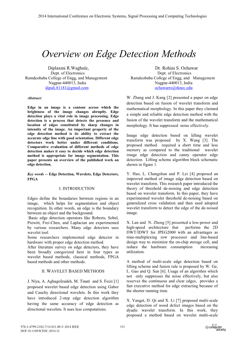 Y. Hao,L。Changshun和P. Lei[4] 提出了一种改进的基于小波变换的图像边缘检测方法。本文介绍了基于小波变换的阈值去噪和边缘检测理论。在本文中,他们已经基于广义交叉验证实验了小波阈值去噪,然后使用采用的小波变换来检测去噪图像的边缘。