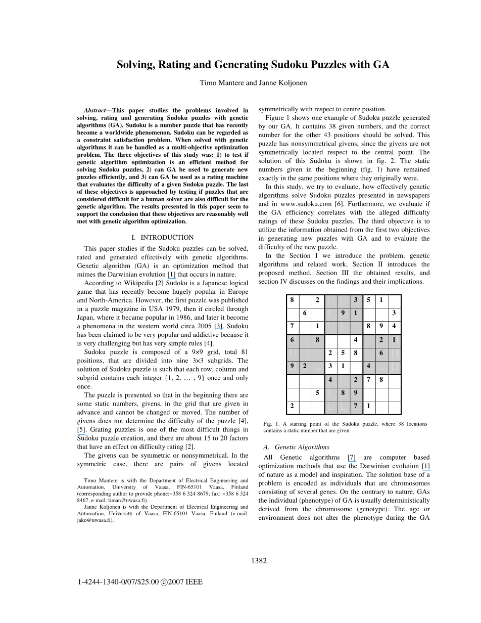 在这项研究中,我们试图评估遗传算法如何有效地解决报纸和www.sudoku.com[6]中提出的数独问题。此外,我们评估GA算法效率是否与这些数独问题的所谓难度等级相关。第三个目标是利用从前两个目标中获得的信息,用GA生成新的问题,并评估新问题的难度。