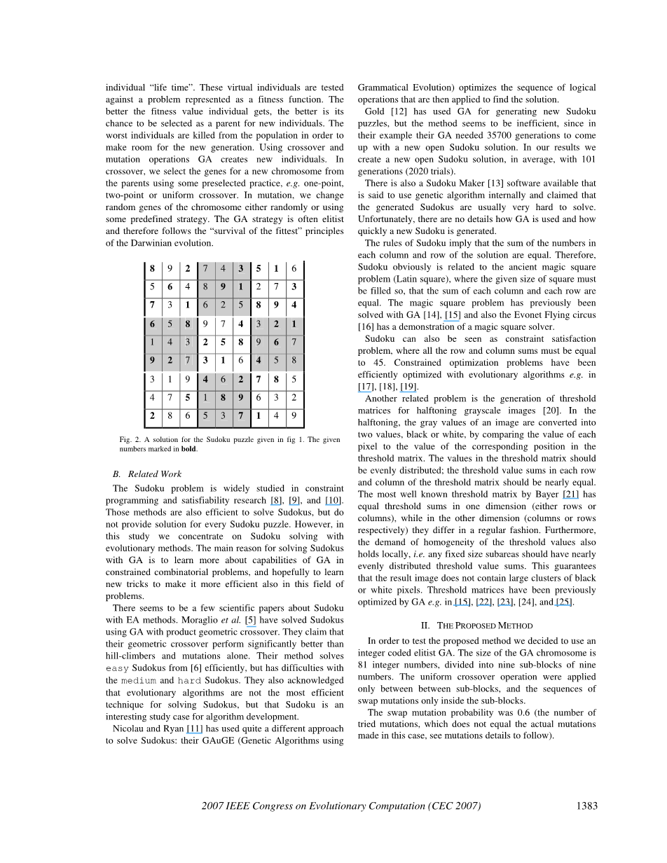 数独也可以被视为约束满足问题,其中所有行和列总和必须等于45。受约束的优化问题已经用进化算法有效地优化,例如[17][18][19]。