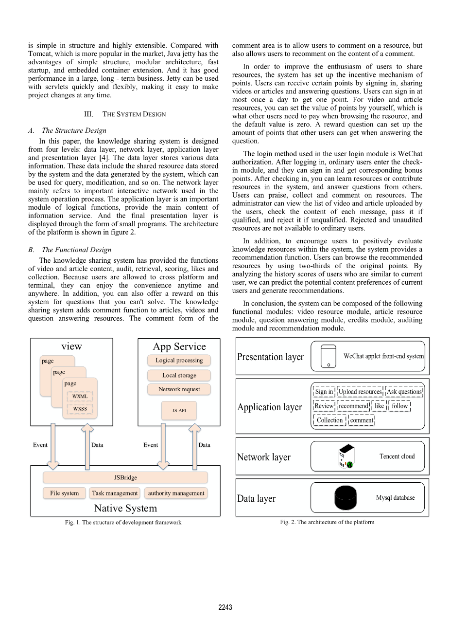 在“互联网 ”的背景下,与知识共享相关的话题越来越重要。知识共享变得越来越重要。知识共享可以减少重复工作的时间,促进知识的不断更新,使一些教育资源更加平衡。它有助于营造一个健康的网络氛围和流行的学习热潮。在高层次知识创新中也发挥着关键作用[1]。然而,当前的知识共享面临着一些困难。基于个人计算机的知识共享模式不能满足用户获取知识的便利性要求。基于应用程序的模式也存在着平台不易推广、用户需求与响应相关性低的问题。而且内容混乱,用户共享内容的审计技术不成熟,没有统一的监管模式,带来监管风险。针对上述问题,利用微信的即时通讯、社交功能、跨平台等特点,设计并实现了一个基于微信小程序的知识共享系统。通过这个小程序,用户可以学习或分享不同类别的资源,并与特定资源(如喜欢、标记和收藏)有效交互。您还可以获得系统推荐的高质量资源。实现了知识共享平台的准确性、便捷性和交互性。