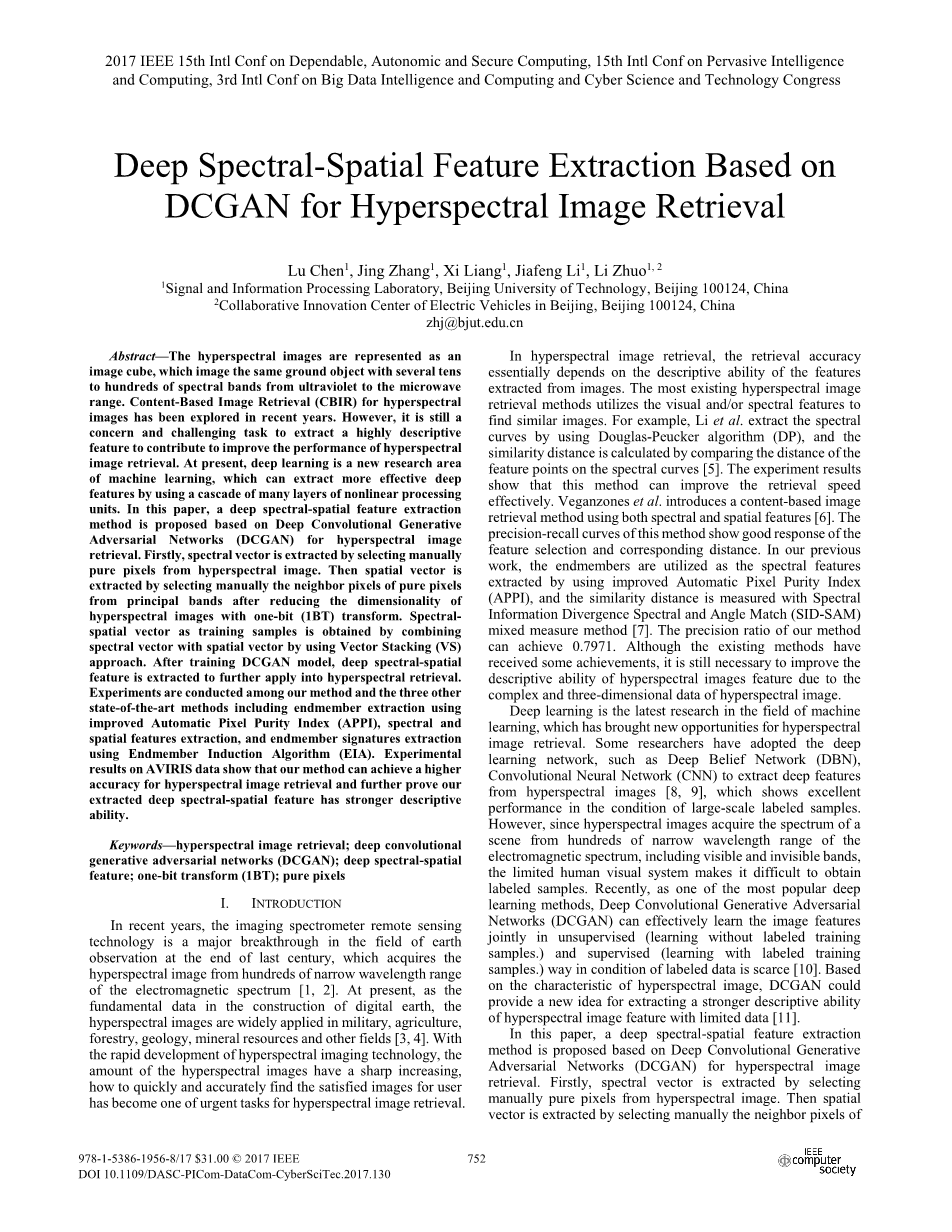 摘要——高光谱图像被表示为图像立方体,它将相同的地面物体成像,从紫外到微波范围有几十到几百个光谱带。近年来已经探索了用于高光谱图像的基于内容的图像检索(CBIR)。然而,提取高度描述性的特征以有助于改善高光谱图像检索的性能仍然是一个关注和挑战性的任务。目前,深度学习是机器学习的一个新的研究领域,它可以通过使用多层非线性处理单元的级联来提取更有效的深度特征。本文提出了一种基于深度卷积生成对抗网络(DCGAN)的高光谱图像检索的深谱 - 空间特征提取方法。首先,通过从高光谱图像中选择手动纯像素来提取光谱矢量。然后通过用一位(1BT)变换减小高光谱图像的维数后手动选择来自主带的纯像素的相邻像素来提取空间矢量。通过使用矢量堆叠(VS)方法将光谱矢量与空间矢量组合来获得作为训练样本的频谱空间矢量。训练DCGAN模型后,提取深谱空间特征,进一步应用于高光谱检索。在我们的方法和其他三种最先进的方法中进行实验,包括使用改进的自动像素纯度指数(APPI)的端元提取,光谱和空间特征提取,以及使用端元感应算法(EIA)的端元特征提取。 AVIRIS数据的实验结果表明,我们的方法可以获得更高的高光谱图像检索精度,进一步证明我们提取的深谱空间特征具有更强的描述能力。