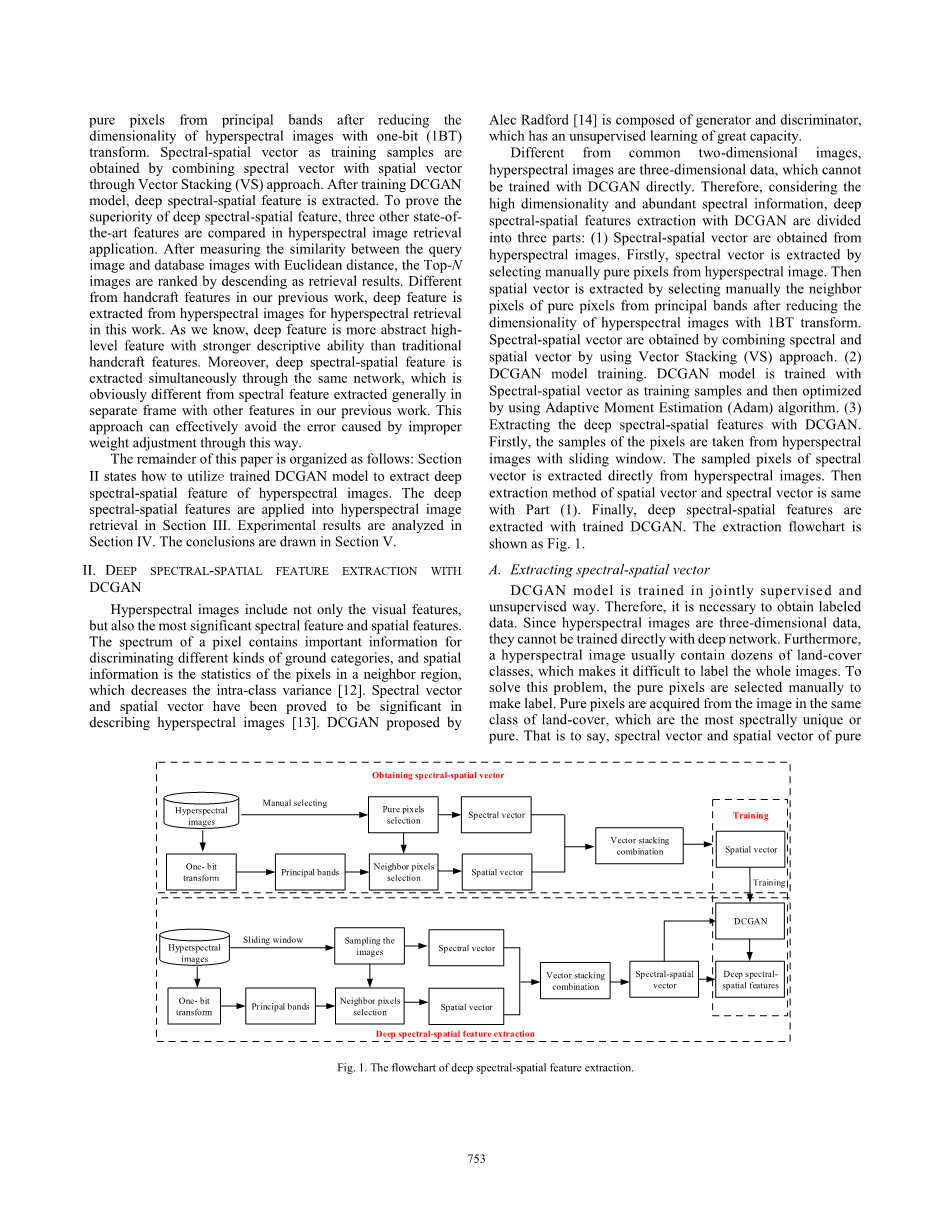本文的其余部分组织如下:第二部分阐述了如何利用训练的DCGAN模型来提取高光谱图像的深度光谱空间特征。 在第III节中,深光谱空间特征被应用于高光谱图像检索。 实验结果在第IV节中分析。 结论见第五节。