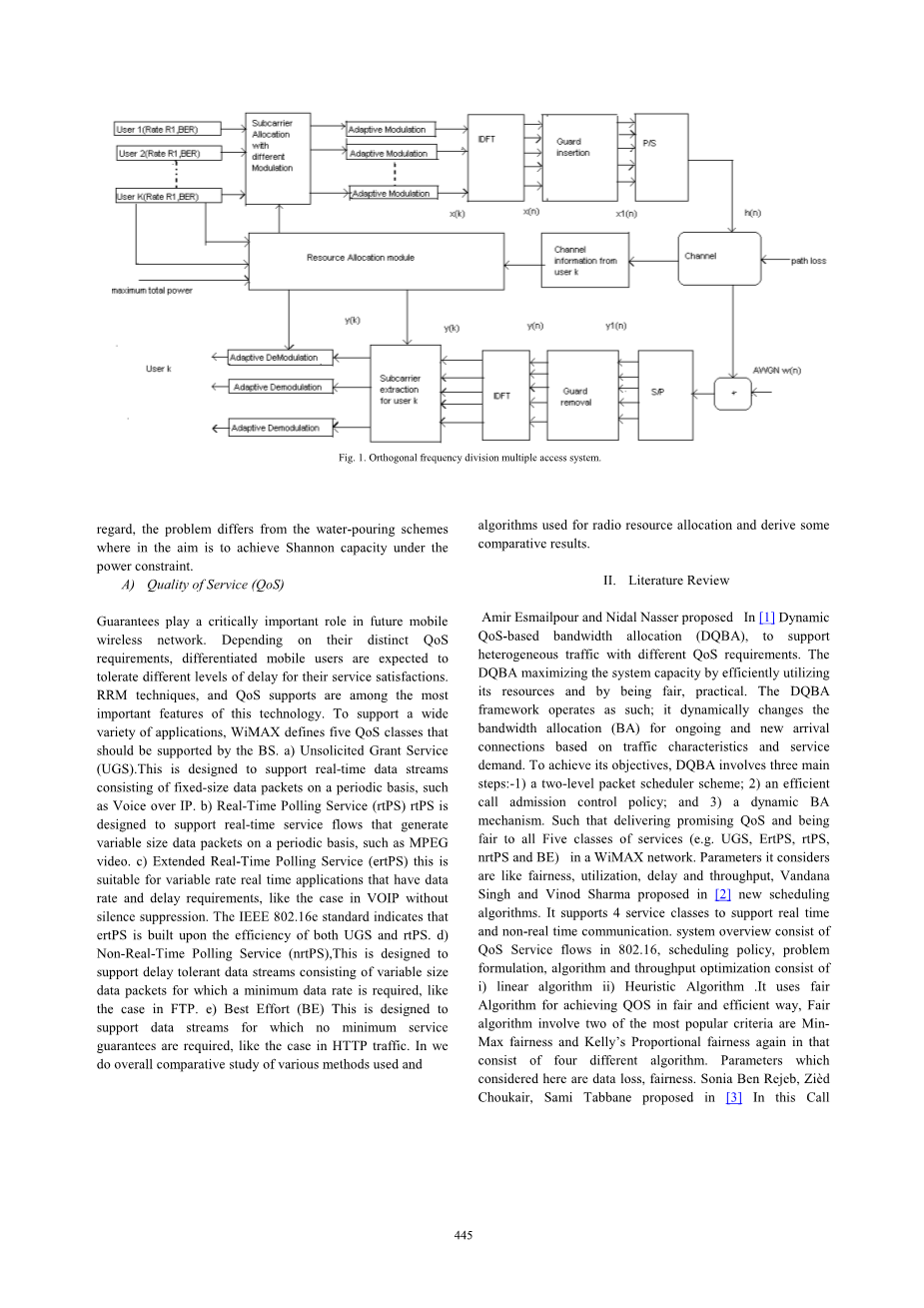 Amir Esmailpour和Nidal Nasser在[1]动态QoS带宽分配(DQBA)中提出,支持不同QoS需求的异构流量。DQBA通过有效利用资源,公平、实用,使系统容量最大化。DQBA框架就是这样运作的;它根据流量特性和服务需求动态地更改正在进行的和新到达的连接的带宽分配(BA)。为了实现其目标,DQBA包括三个主要步骤:1)两级包调度方案;2)有效的呼叫接纳控制策略;3)动态BA机构。从而在WiMAX网络中提供有前途的QoS,并对所有五类服务(例如UGS、ErtPS、rtPS、nrtPS和BE)都是公平的。它考虑的参数包括公平性、利用率、延迟和吞吐量,Vandana Singh和Vinod Sharma在[2]新的调度算法中提出。它支持4个服务类来支持实时和非实时通信。系统概述由802.16中的QoS服务流程组成,调度策略、问题制定、算法和吞吐量优化由1)线性算法2)启发式算法组成。它使用公平算法以公平高效的方式实现QOS,公平算法中涉及的两个最常用的准则是最小公平和Kelly的比例公平,其中又包含了四种不同的算法。这里考虑的参数是数据丢失、公平性。Sonia Ben Rejeb, Zied Choukair, Sami Tabbane在[3]中提出了这个呼叫接纳控制(CAC)模型,该模型具有4个优先级,支持5类服务(例如UGS、ErtPS、rtPS、nrtPS和BE)。为了保持HO的优先级,假设系统在预定通道方案和排队策略下运行。模型必须在两个相互冲突的需求之间保持平衡:最大化资源利用率和最小化强制切换调用丢弃率。CAC是一种基于三种方法的呼叫接纳控制,即:a)实时的新呼叫处理。b)非实时新呼叫处理c)实时HO(移交呼叫)呼叫处理d)非实时HO呼叫处理。Tolga Girici, Chenxi Zhu, Jonathan R. Agre和Anthony Ephremides。在[4]下行链路资源分配中,提出了基于OFDMA的无线系统中数据用户长期接收率和实时会话服务质量的比例公平性。
