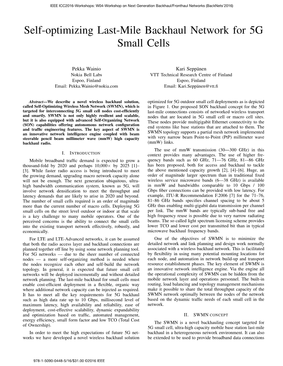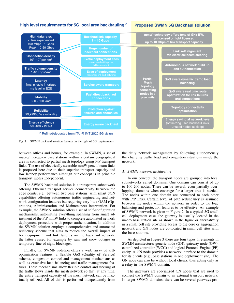 摘要 – 我们描述了一种新型无线回程解决方案,称为自优化无线网状网络(SWMN),其目标是经济高效地智能地互连5G小型蜂窝节点。 SWMN不仅具有高弹性和可扩展性,而且还配备了先进的自组织网络(SON)功能,可提供自主网络配置和流量工程功能。 SWMN的一个关键方面是创新的智能网络,结合光束可控铅笔束毫米波(mmW)高容量回程无线电。