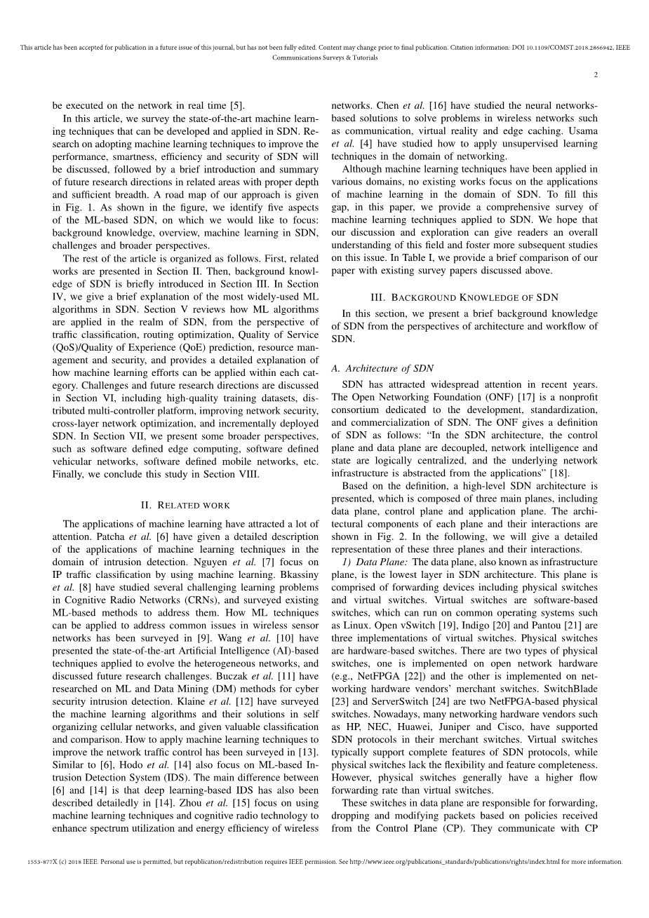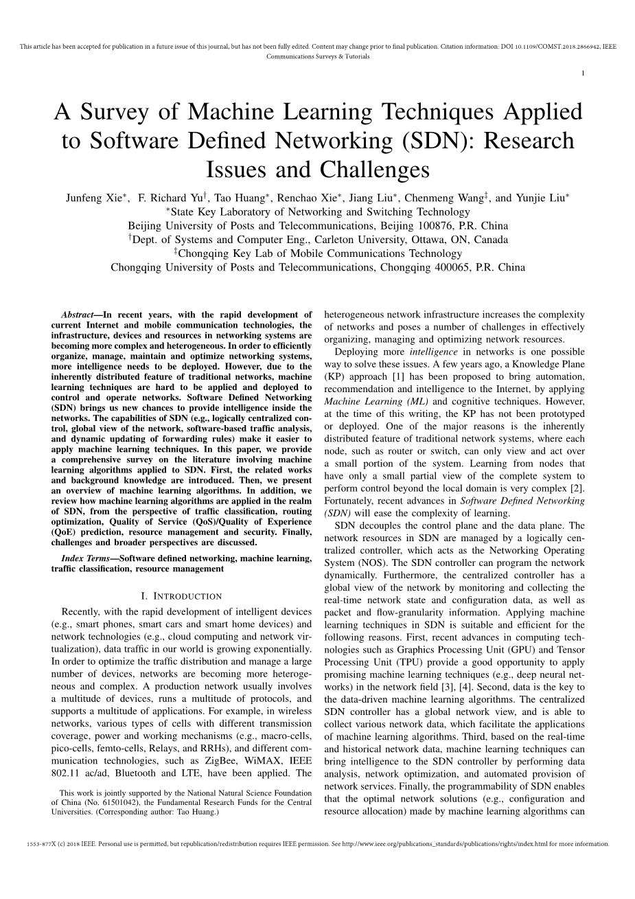 虽然机器学习技术已经在各个领域得到应用,没有现成的作品专注于机器学习的SDN域的应用程序。为了填补这一空白,在本文中,我们提供了适用于SDN机器学习技术的全面调查。我们希望我们的讨论和探索可以给读者这个领域有全面的了解,并促进这方面的更多后续研究。在表一中,我们提供了与上面所讨论的现有调查试卷纸的简单比较。