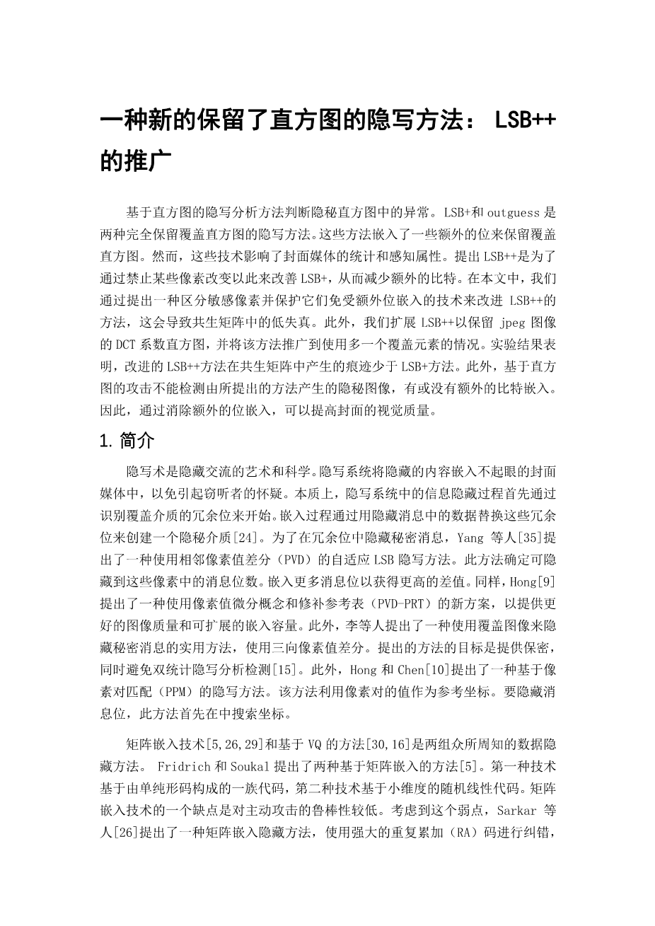 一种新的保留了直方图的隐写方法:LSB 的推广外文翻译资料 2021-11-06 17:55:09 英语原文共 12 页 英语原文共 18 页 原文和译文剩余内容已隐藏,您需要先支付 30元 才能查看原文和译文全部内容!立即支付 发小红书推广免费获取该资料资格。点击链接进入获取推广文案即可: Ai一键组稿 | 降AI率 | 降重复率 | 论文一键排版 PREVIOUS NEXT 您可能感兴趣的文章 带有Mini-LED背光的高动态范围液晶显示器外文翻译资料 基于局部直方图均衡的分层曝光无伪影高动态范围成像外文翻译资料 深入了解卷积外文翻译资料 基于局部和全局强度信息的主动轮廓模型用于医学图像分割外文翻译资料 采用叠加场效应管结构的毫米波功率放大器的分析与设计外文翻译资料 用于宽带包络跟踪的动态堆叠控制CMOS射频功率放大器外文翻译资料 文本无关说话人识别综述:从特征到超向量外文翻译资料 用SIMULINK启动外文翻译资料 AlGaN/GaN HEMT中电子迁移率与欧姆接触宽度关系的研究外文翻译资料 基于物联网的实时二氧化碳监测云技术外文翻译资料