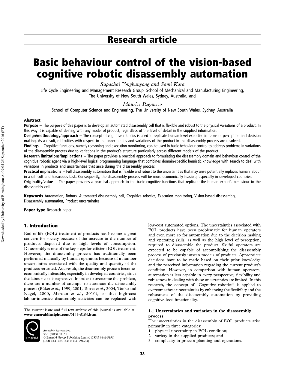 产品废弃(EOL)处理已成为社会高度关注的问题,因为由于高消费水平而处置的产品数量增加。 拆卸是高效EOL处理的关键步骤之一。 然而,由于与返回产品的质量和数量相关的数量不确定性,拆卸过程传统上由人工操作员手动执行。 因此,拆卸过程在经济上不可行,特别是在发达国家,因为人工成本很高。 为了克服这个问题,有许多尝试使拆卸过程自动化(Buuml;ker等人,1999,2001,Torres等人,2004,Tonko和Nagel,2000,Merdan等人,2010) ,这样高成本的劳动密集型拆卸活动可以被低成本的自动化选项取代。由于决策制定和操作技巧以及拆解产品所需的高度认知度,与EOL产品相关的不确定性对于操作人员来说是有难度的,对于自动化来说更是如此。 希望熟练的操作员能够完成以前看不见的产品模型的拆卸过程。 必须根据他们的先验知识和关于当前产品状况的感知信息作出适当的决定。 但是,与人类操作员相比,自动化在各个角度都不太适用。 处理这些不确定性的灵活性和稳健性是有限的。 在这项研究中,“认知机器人技术”的概念被应用于通过提供认知级功能来增强拆卸自动化的灵活性和稳健性来克服这些不确定性。
