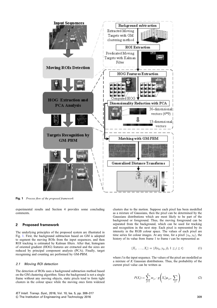 拟议系统的基本原则如所示。 图1。首先,采用基于GM的背景减法。从输入序列分割移动的ROI,然后用卡尔曼滤波器估计感兴趣区域跟踪。之后,柱状图提取定向梯度(HOG)特征,并确定其大小。通过主成分分析(PCA)减少。最后,目标由GM-PBM进行识别和计数。