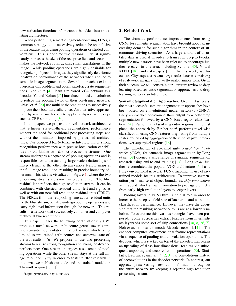 本文的贡献如下:(1)我们提出了一种新的网络架构,它不局限于预先训练好的架构,而是针对街景中精确的语义分割,达到了最先进的效果。(ii)我们建议使用两个处理流存储实现强识别和强定位性能:一个流执行一系列池操作,而另一个流保持完整的图像分辨率。(iii)为了促进该领域的进一步研究,我们在Theano/Lasagne中发布了我们的代码和经过培训的模型[1,14]。