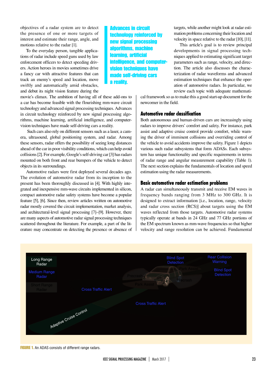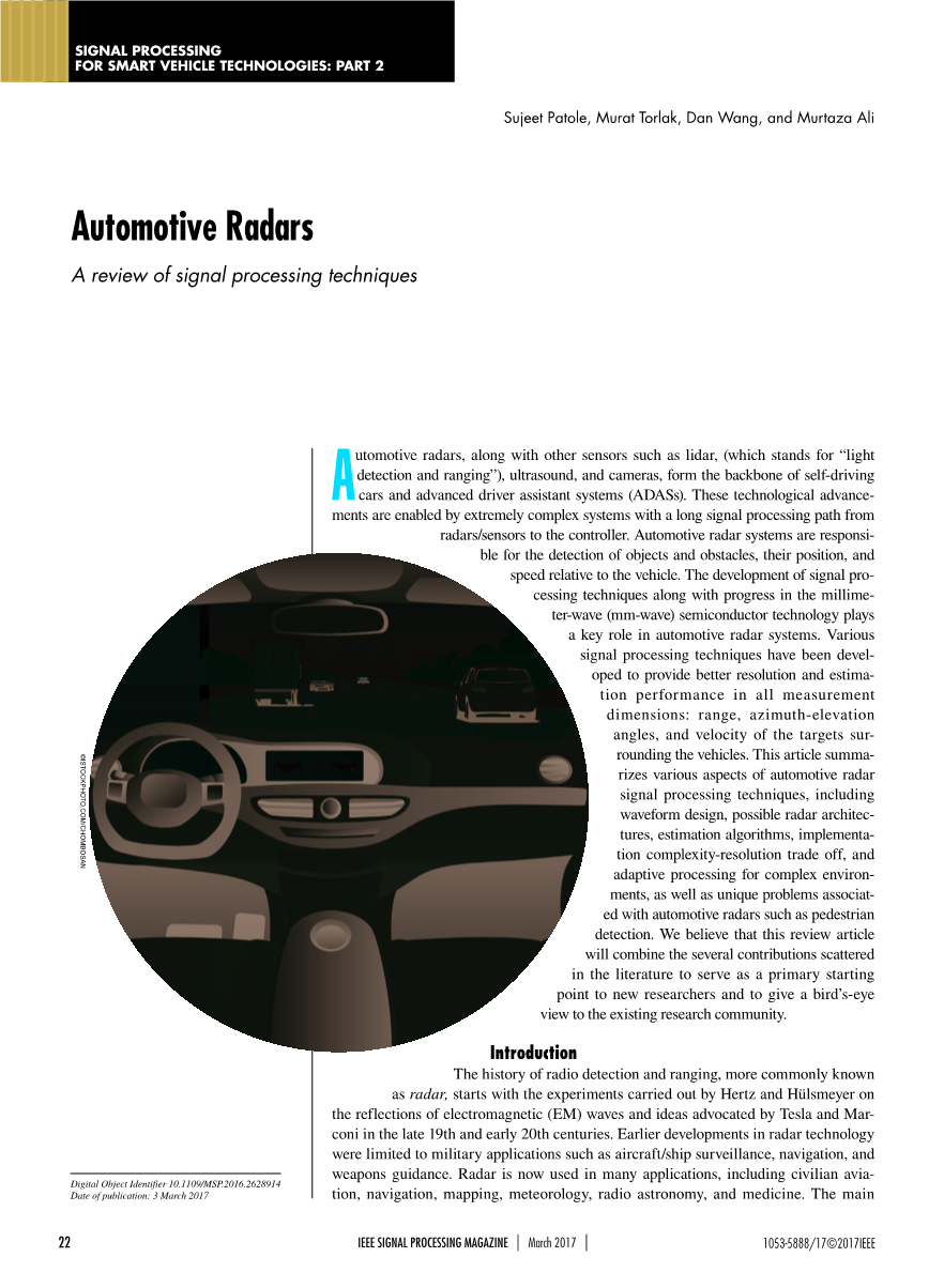 汽车雷达以及其他传感器如激光雷达(代表“光探测和测距”)、超声波和摄像头构成了自动驾驶汽车和高级驾驶辅助系统(ADASs)的支柱。这些技术进步是由极其复杂的系统实现的,具有从雷达/传感器到控制器的长信号处理路径。汽车雷达系统负责检测物体和障碍物、它们的位置以及相对于车辆的速度。信号处理技术的发展以及毫米波半导体技术的进步在汽车雷达系统中起着关键作用众多已经开发的各种信号处理技术以在所有测量维度中提供更好的分辨率和估计性能,包括范围,方位角仰角和车辆周围的目标的速度。本文总结了汽车雷达信号处理技术的各个方面,包括波形设计,可能的雷达架构,估算算法,实现复杂度-分辨率折衷,复杂环境的自适应处理,以及与行人检测等汽车雷达相关的独特问题。我们认为,这篇综述文章将把文献中散布的几个贡献结合起来,作为新研究人员的主要出发点,并对现有的研究界成果进行梳理。