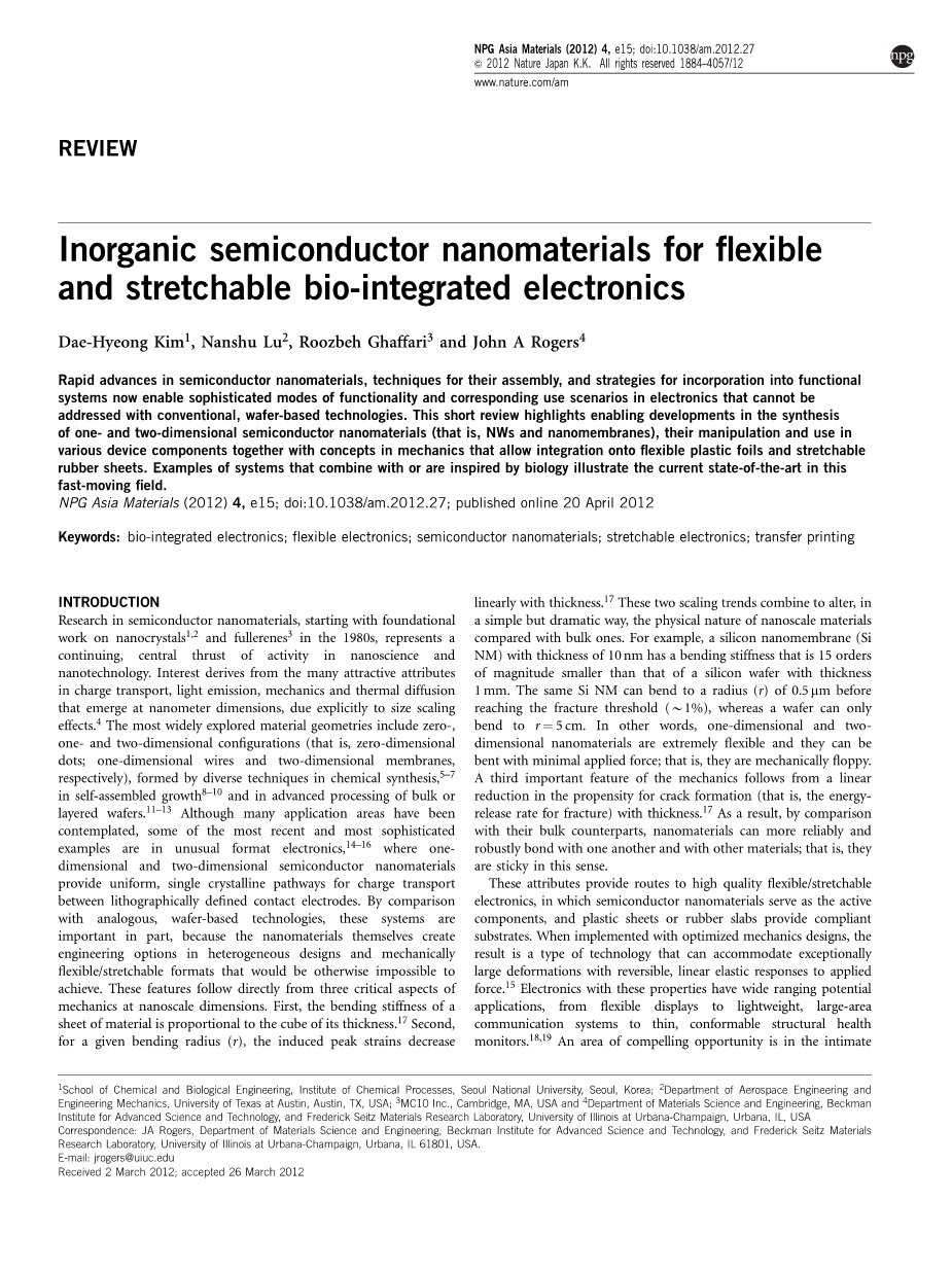 半导体纳米材料的研究始于上世纪80年代对纳米晶体1,2和富勒烯3的基础性研究,是纳米科学和纳米技术活动的一个持续的中心推动力。科学家的兴趣源于电荷传输,光发射,力学和热扩散的许多有吸引力的属性,这些属性在纳米尺寸上出现,明显是由尺寸缩放效应4引起的。最广泛探索的材料几何形状包括零维,一维和二维结构(即零维点,一维线和二维面),由化学合成中的各种技术形成5-7,自组装生长8-10,以及散装或分层晶圆的高级加工11 -13。虽然已经考虑了许多应用领域,但一些最新和最复杂的例子是不寻常的电子形式14-16,其中一维和二维半导体纳米材料为光刻定义的接触电极之间的电荷传输提供统一的单晶通道。与类似的基于晶片的技术相比,这些系统在一定程度上是重要的,因为纳米材料本身在异构设计和机械柔性/可拉伸格式中创建了工程选项,否则将无法实现。这些特征直接来自纳米级尺寸的力学的三个关键方面。首先,板材的抗弯刚度与其厚度的立方成正比17。其次,在给定的弯曲半径(r)下,诱导峰值应变随厚度线性减小。这两种尺度变化趋势结合在一起,以简单但戏剧性的方式改变纳米级材料与块状材料的物理性质。例如,厚度为10nm的硅纳米膜(Si NM)的弯曲刚度比厚度为1mm的硅晶片的弯曲刚度小15个数量级。相同的Si NM之前可以弯曲到0.5mm的半径(r)达到破裂阈值(B1%),而晶圆只能弯曲到rfrac14;5厘米。换句话说,一维和二维纳米材料非常灵活,它们可以以最小的施加力弯曲;也就是说,它们在机械上是松软的。力学的第三个重要特征来自于裂缝形成倾向的线性减少(即裂缝的能量释放速率)随着厚度的增加17。结果表明,与体积材料相比,纳米材料与其他材料之间的键合更可靠、更牢固,也就是说,它们在这个意义上是粘性的。