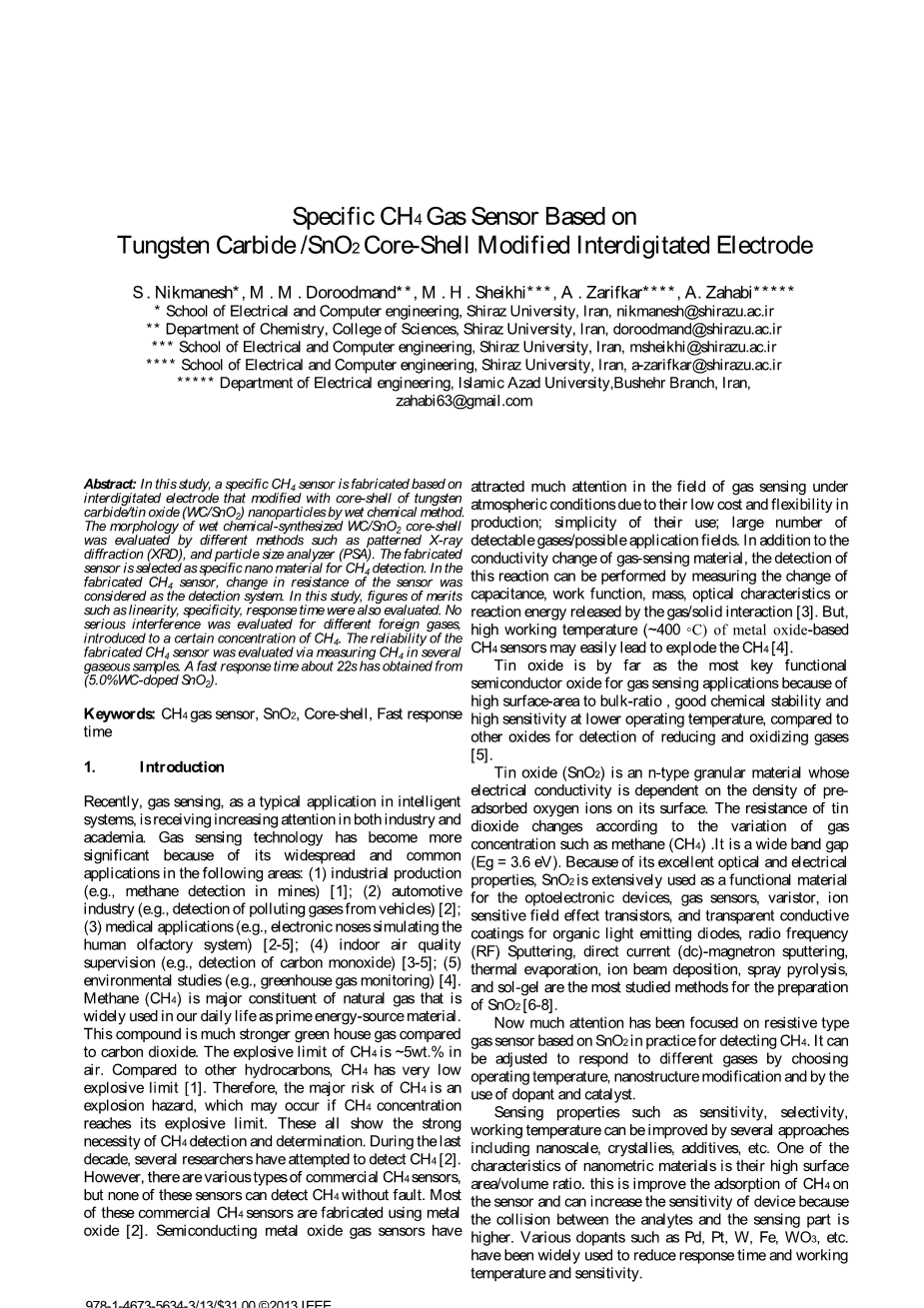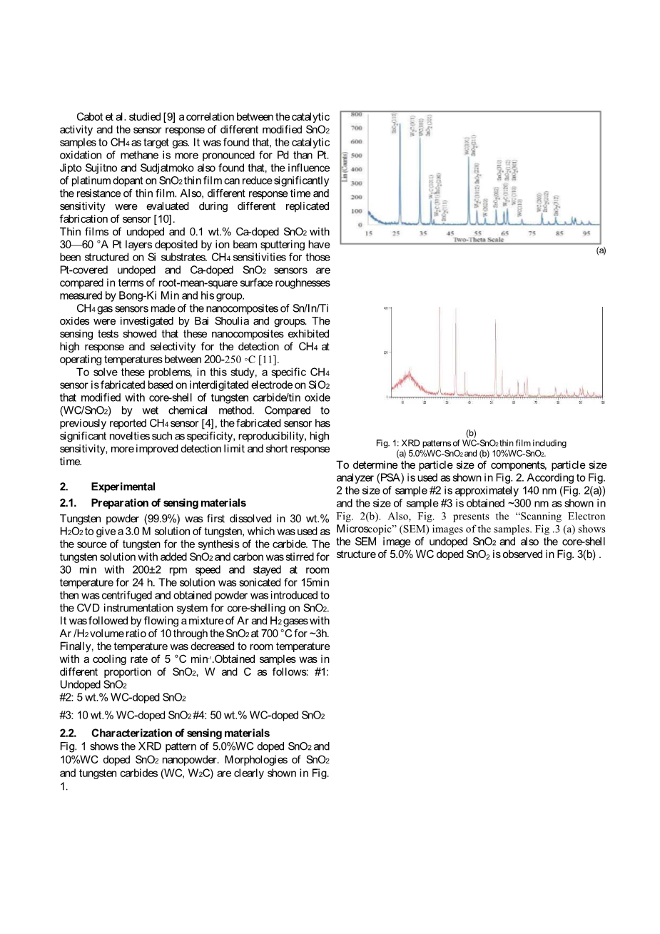 为了解决这些问题,本研究采用湿法化学方法,在SiO2的交叉电极上制备了一种特殊的CH4传感器,该电极采用碳化钨/氧化锡(WC / SnO2)的核壳改性。 与先前报道的CH4传感器[4]相比,制造的传感器具有显着的新颖性,如特异性,再现性,高灵敏度,更高的检测限和更短的响应时间。