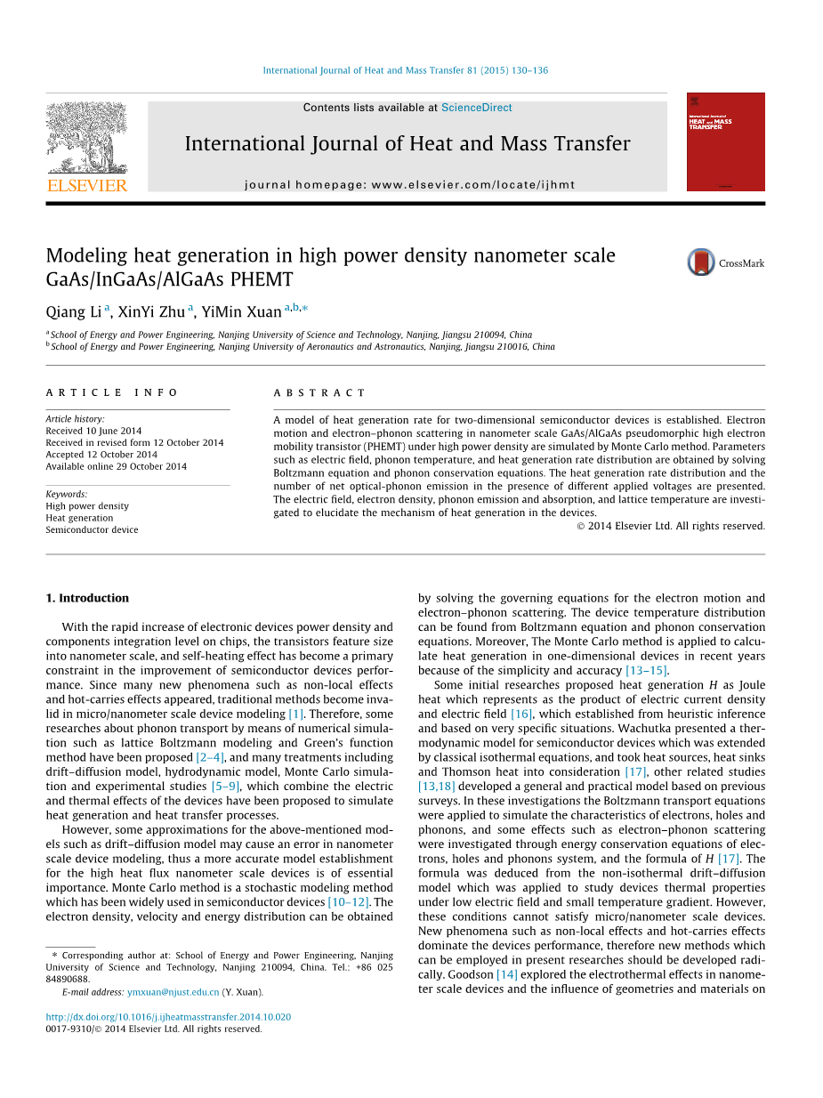 高功率密度纳米级GaAs/InGaAs/AlGaAs PHEMT中热的模拟外文翻译资料