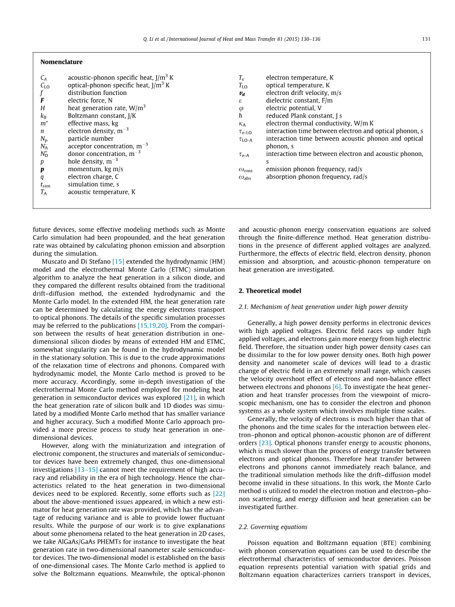 然而,随着电子元器件的小型化和集成化,半导体器件的结构和材料发生了巨大的变化,因此,一维调查[13-15]已不能满足高科技时代对高质量、高可靠性的要求。因此,需要对二维器件中与热产生有关的特征进行探讨。最近在上述问题上出现了一些诸如[22]这样的努力,其中提供了一种新的蓄热器,它具有减小方差的优点,并能提供较低的波动结果。我们的工作目的是解释2D情况下与热产生有关的一些现象,,我们以AlGaAs/GaAs PHEMT为例,研究了二维纳米级半导体器件的热产生速率。在一维情形的基础上建立了二维模型。采用蒙特卡罗方法求解Boltzmann方程。同时,利用有限差分法求解了光学声子和声子能量守恒方程。分析了不同电压下的热产生规律,并分析了电场、电子密度、声子发射和吸收以及声压等因素对热产生的影响。研究了温度对发热量的影响。