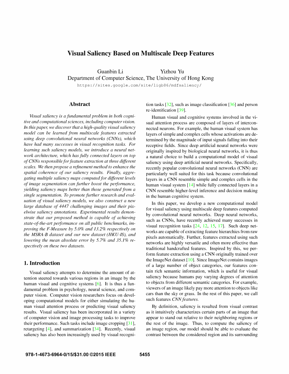 视觉显著性是认知科学和计算科学(包括计算机视觉)的一个基本问题。在本文中,我们发现一个高质量的视觉显著性模型可以从提取的多尺度特征中学习,使用深度卷积神经网络(deep tional neural network, CNNs),其中在视觉识别任务中取得了很多成功。为了学习这种显著性模型,我们引入了一种神经网络结构,该结构在神经网络的顶层建立了完整的连接层,负责三种不同尺度的特征提取。在此基础上,提出了一种改进方法,来获取显著性的空间一致性的结果。最后,为不同级别的图像分割而计算的多重显着性映射可以进一步提高图像分割的性能,从而产生比从单个图像分割生成的显着性映射更好的效果。为了促进视觉显着性模型的进一步研究和评价,我们还构建了一个新的大型数据库,包含4447幅具有挑战性的图像及其像素级显着性注释。实验结果表明,所提出的方法能够在所有公共基准上达到最先进的性能,分别将F-测度提高了5.0%和13.2%。MSRA-B数据集和我们的新数据集(HKV-IS),在这两个数据集上平均绝对误差降低5.7%和35.1%。