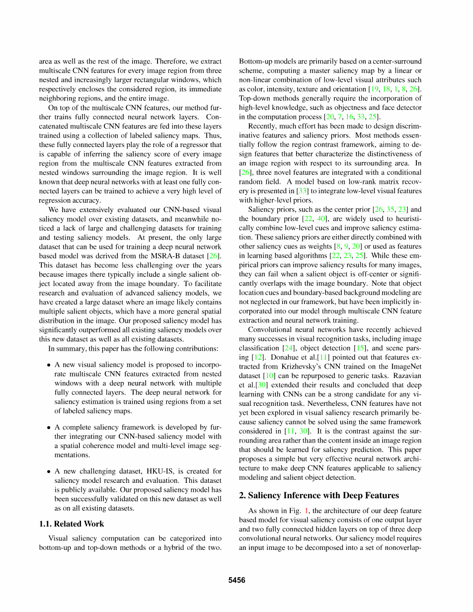 卷积神经网络最近在视觉识别任务方面取得了许多成功,包括图像分类[24]、目标检测[15]和场景分析[12]。Donahue等人[LL]指出,从Krizhevsky的CNN中提取的关于ImageNet数据集[10]的特征可以被重新定位为一般任务。Razavianet A1.[30]扩展了他们的结果,并得出结论:使用CNNs进行深度学习可以成为任何视觉识别任务的有力候选。尽管如此,cnn的报道还没有被解释清楚。 视觉显着性研究中的ED主要是因为视觉显着性不能用[1,30]中所考虑的同样的框架来解决。应该学习的是与周围区域的对比,而不是图像区域内的内容,以便进行显着性预测。本文提出了一种简单但非常有效的神经网络。 网络体系结构,使深度CNN特性适用于显着性建模和显着性目标检测。