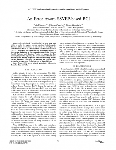 与此工作密切相关的第二类应用程序包括利用ErrP作为错误感知机制,可以促进创建响应更快的接口。在这种情况下,需要纠正的错误动作通常是由BCI系统本身而不是用户引起的。例如,[17]中的作者在机器人的基于思维的控制界面中使用了ErrP信号,指出哪些命令是错误的并且应该被舍弃。向对象提供视觉反馈,指示在实际执行给定命令之前分类器的输出(例如,向左转)。如果反馈引出ErrP,则忽略该命令,机器人继续执行上一个命令。报告的结果对于ErrPs在提高现有BCI系统的可靠性和准确性方面的应用是令人鼓舞的。在同一方向,[18]的作者利用具有错误意识的神经相关性,以便在基于P300的BCI中实现更高的ITR。这项工作中提出的方法属于这类应用,因为它利用ErrP信号作为BCI系统的错误感知机制。然而,与脑控制界面和P300拼写器相比,我们的BCI系统实现了一个网站界面,它依赖于SSVEP信号来区分网站提供的多种选择。据我们所知,这是第一个将ErrP与SSVEP相结合的工作,提供了一个错误感知的网站管理BCI。