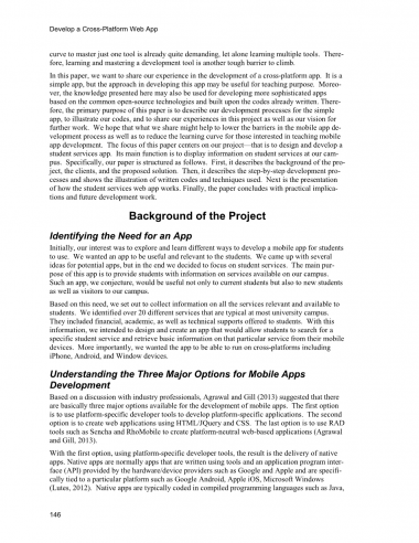 根据与行业专业人士的讨论,Agrawal和Gill(2013)表示,移动应用程序的开发基本上有三种主要选项:第一个选项是用平台特有的开发工具开发单平台应用软件;第二个选项是用HTML/JQuery and CSS等软件开发应用;最后一个选项是使用RAD工具比如Sencha和RhoMobile去开发一个中立平台的基于网页的应用程序(Agrawal and Gill, 2013)。在第一个选项下,使用平台特有的开发工具,结果是会开发一个局限于特有平台的原生应用。原生应用通常是使用工具以及硬件/设备提供商提供的应用程序接口(API),例如谷歌和苹果都与特定的平台如谷歌安卓、苹果iOS、微软(Lutes, 2012)。原生应用一般是由编译的编程语言编写如Java、Objective C, or C#。原生应用通常很强大,因为它们可以访问特定于设备的功能(Lutes, 2012)。所有的原生应用的下载都要通过应用商店如苹果应用商店、谷歌应用商店等,本机应用程序直接安装在设备本身上,可在本地使用,因此无需连接到网络即可运行。第二个选项使用HTML/JQuery和CSS,则会开发出移动网络应用程序。移动网络应用程序的功能基本上与使用针对移动设备优化的用户界面设计的网站相同,它不依赖于设备,因为它通常使用基于标准的Web浏览器技术进行编码,例如HTML,CSS,JavaScript,PHP(Lutes,2012)而不是编译的程序语言。虽然它运行起来像一个原生应用,一个网页应用不需要被下载或安装在设备上,移动设备上的Web浏览器通过指定的URL调用它,因此,运行它需要互联网连接。最后一个选项使用平台中立的基于Web的应用程序创建混合型应用程序。这种应用程序结合了本机应用程序和移动网页应用程序的特性。它和手机网页应用一样是用HTML、CSS、JavaScript或PHP编写,但它被编译成本机应用程序,以便通过供应商应用程序商店进行分发。从使用者的角度来看,原生应用与混合型应用还是有些许差别的,只要设备具有Web浏览器,跨平台应用程序就可以像本机应用程序一样运行。从开发者的角度来看,混合型应用程序是真正的跨平台的。同样的HTML代码可以运行于不同的平台上。这可能是因为所有主流智能手机系统都支持可运行HTML5、CSS、JavaScript代码的手机浏览器并且使用本地设备存储。开源库和开发工具以一个Web浏览器小部件形式的提供了一个带有主用户界面(UI)的shell项目,正是这个小部件处理HTML5,CSS和JavaScript代码并将它们打包到本机应用程序中(Lutes,2012)。
