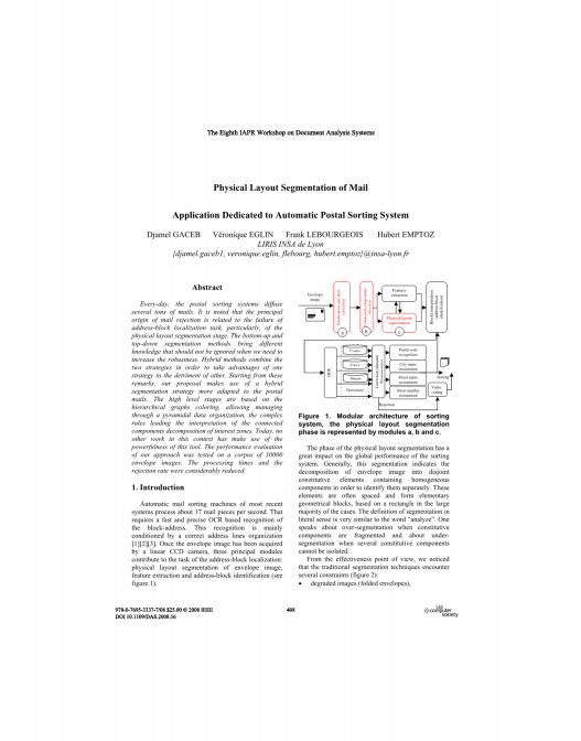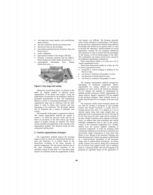 将包络图像分解成不相交的包含均匀的组成元素组件,以便分别识别它们。这些元素通常是间隔的并且形成基本的几何块,基于大的矩形大多数情况。分割的定义字面意义与“分析”这个词非常相似。模块化排序架构系统,物理布局分割阶段由模块a,b和c表示。当构成时说出过分割当几个构成组件时,组件是碎片化的,并且是关于欠分裂的无法孤立。从效果的角度来看,我们注意到了传统的分割技术遇到了几个限制因素(图2):降级图像(折叠信封),非常大的邮件品种(质量,颜色和不同纸纹理),实时约束(有限的处理时间),信封上的文字线偏斜,字符,线条和字符之间的间距不均匀文本块,结果的义务,图像的高空间分辨率(300 dpi),地址块附近存在寄生元素(邮票,邮局标记,印刷标识......),叠加信息层(邮票,手写笔记......)。考虑到这些限制,我们在此提出建议纸张原始物理布局方法邮件图像的分割。使用图论,我们的技术原理是基于数据的金字塔形表示。根本目标在于提高每个人的表现分割阶段及其与另一阶段的一致性阶段,以减少邮件拒绝和时间处理到最大。开发的方法将被集成到自动邮件系统中排序。本文的其余部分安排如下:引用了各种分割方法第2节,其中以前的作品和集合提出限制。在第三节,正式图表着色的方面是详细的。第四个部分描述了着色的应用分割问题。然后获得结果评论和讨论。