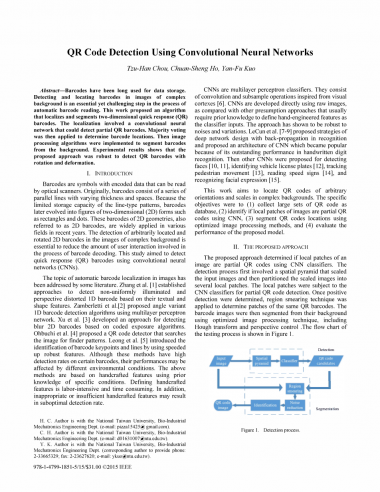 摘要--条形码长期以来一直用于数据存储。在复杂背景图像中检测和定位条形码是条形码自动读取过程中一个重要而又具有挑战性的步骤。提出了一种定位和分割二维快速响应(QR)条形码的算法。定位涉及到卷积神经网络,可以检测部分二维码。然后应用多数投票来确定条形码的位置。然后利用图像处理算法对背景条码进行分割。实验结果表明,该方法对具有旋转和变形的二维码具有较强的鲁棒性。
