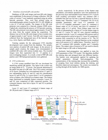 建立了二维码图像和非二维码图像数据库。在图像采集过程中,利用在线条码生成器随机生成200个版本7的二维码。然后用一台电照相打印机(LaserJet M1132, HP;(600dpi),每个模块的尺寸为IS mil。二维码打印输出的图像由条形码扫描仪(9200系列,密码学实验室)获取,模拟二维条形码扫描的过程。在采集过程中,二维码打印输出被放置在距离扫描仪大约10和20厘米的地方。距离设置为二维码图像的模块大小约为4和7像素。从条形码图像的背景区域(如文本、数字和空白区域)采集非二维码图像。