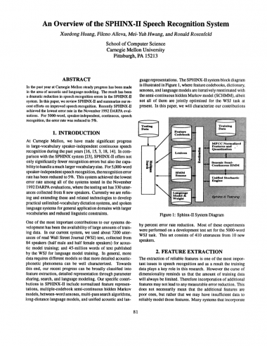 SPHINX-II系统中语音识别错误显著地减少。在本文中,我们回顾了SPHINX-II系统并总结了我们在改进语音识别方面的努力。 最近SPHINX-II在1992年11月的DARPA评估中实现了最低的错误率。 对于5000字的独立说话人的连续的语音识别,错误率降低到5%。