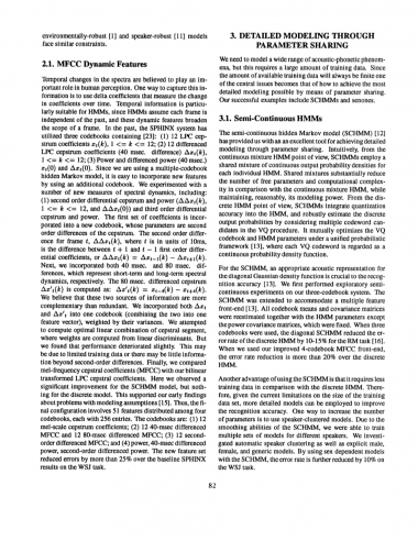 使用SCHMM的另一个优点是与离散HMM相比较它只需要更少训练数据。因此,鉴于目前对培训数据集规模的限制,可以采用更详细的模型来改进识别准确性。增加参数数量的一种方法是使用扬声器群集模型。因为SCHMM的平滑能力,我们能够训练适用于不同扬声器的多套型号。我们研究了自动扬声器聚类以及明确的男性,女性和通用模型。通过将性别依赖模型用于SCHMM,在WSJ的任务上错误率进一步降低10%。