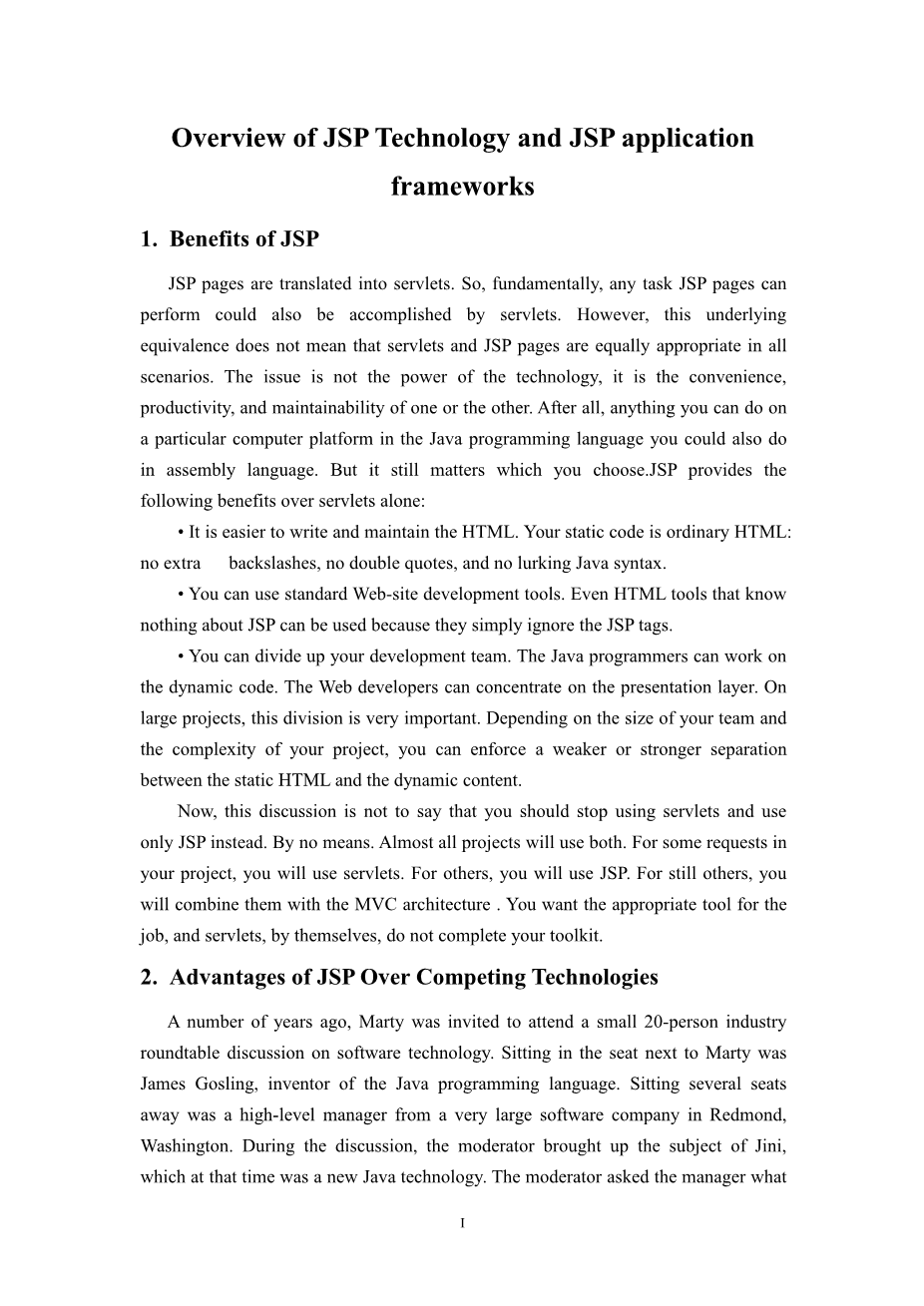Now, the grievance that Gosling was airing was that he felt that this company would take technology from other companies and suborn it for their own purposes. But guess what? The shoe is on the other foot here. The Java community did not invent the idea of designing pages as a mixture of static HTML and dynamic code marked with special tags. For example, ColdFusion did it years earlier. Even ASP (a product from the very software company of the aforementioned manager) popularized this approach before JSP came along and decided to jump on the bandwagon. In fact, JSP not only adopted the general idea, it even used many of the same special tags as ASP did..So, the question becomes: why use JSP instead of one of these other technologies? Our first response is that we are not arguing that everyone should. Several of those other technologies are quite good and are reasonable options in some situations. In other situations, however, JSP is clearly better. Here are a few of the reasons.