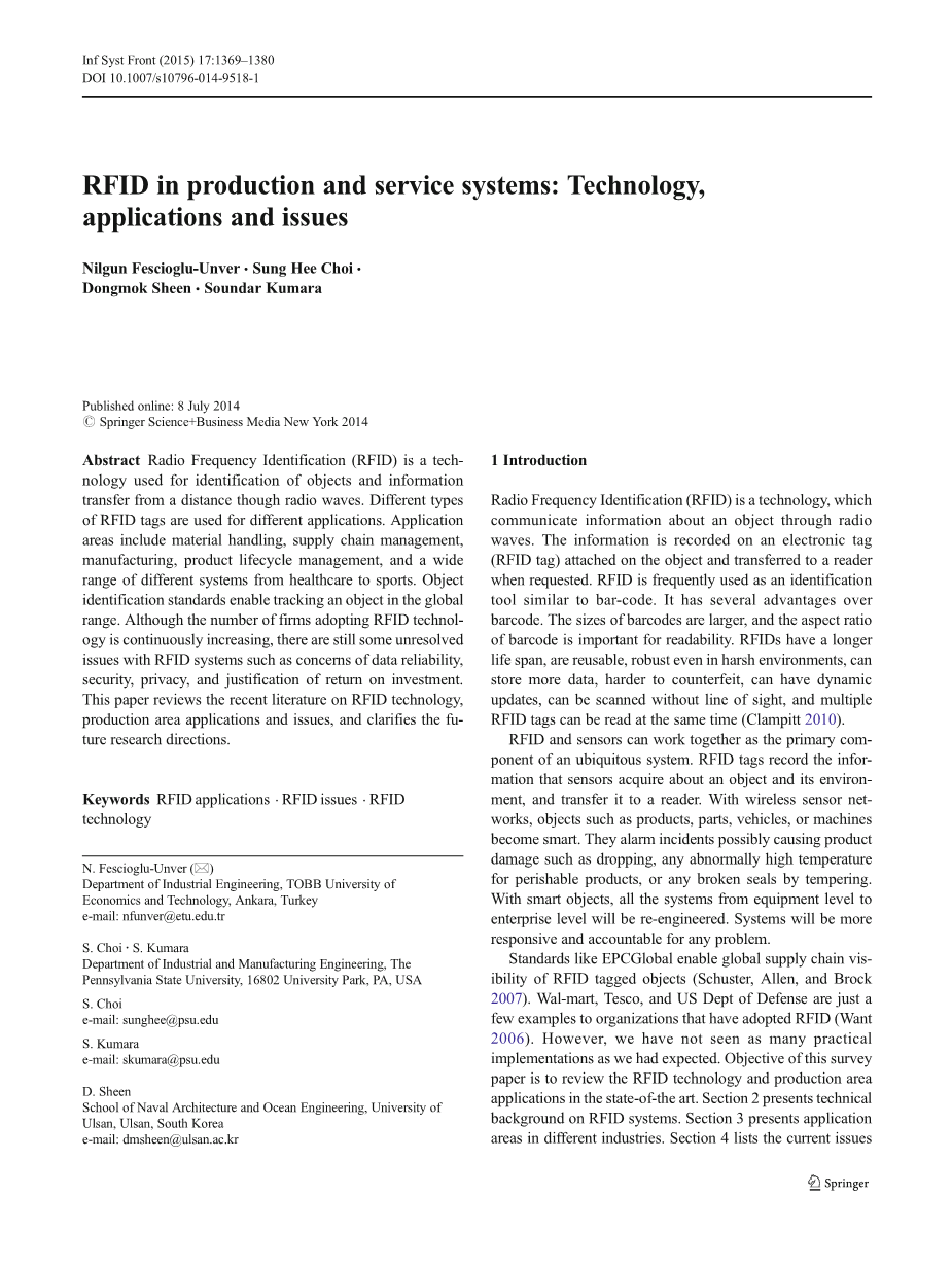 摘要:射频识别技术(RFID)是一种用于对象和信息的识别的远距离无线电波传输技术,不同类型的RFID被用于不同的应用。 应用领域包括材料处理,供应链管理,制造,产品生命周期管理,以及大范围的从医疗到体育的不同系统。目的识别标准使得对象可以在全球范围内被追踪。虽然采用RFID技术的企业数量不断增加,仍有一些与RFID系统有关的问题未得到解决,比如数据可靠性问题,安全性,隐私性,以及投资回报的原则。本文回顾了RFID技术的最新文献,生产领域的应用和问题,并阐明了未来的研究方向。