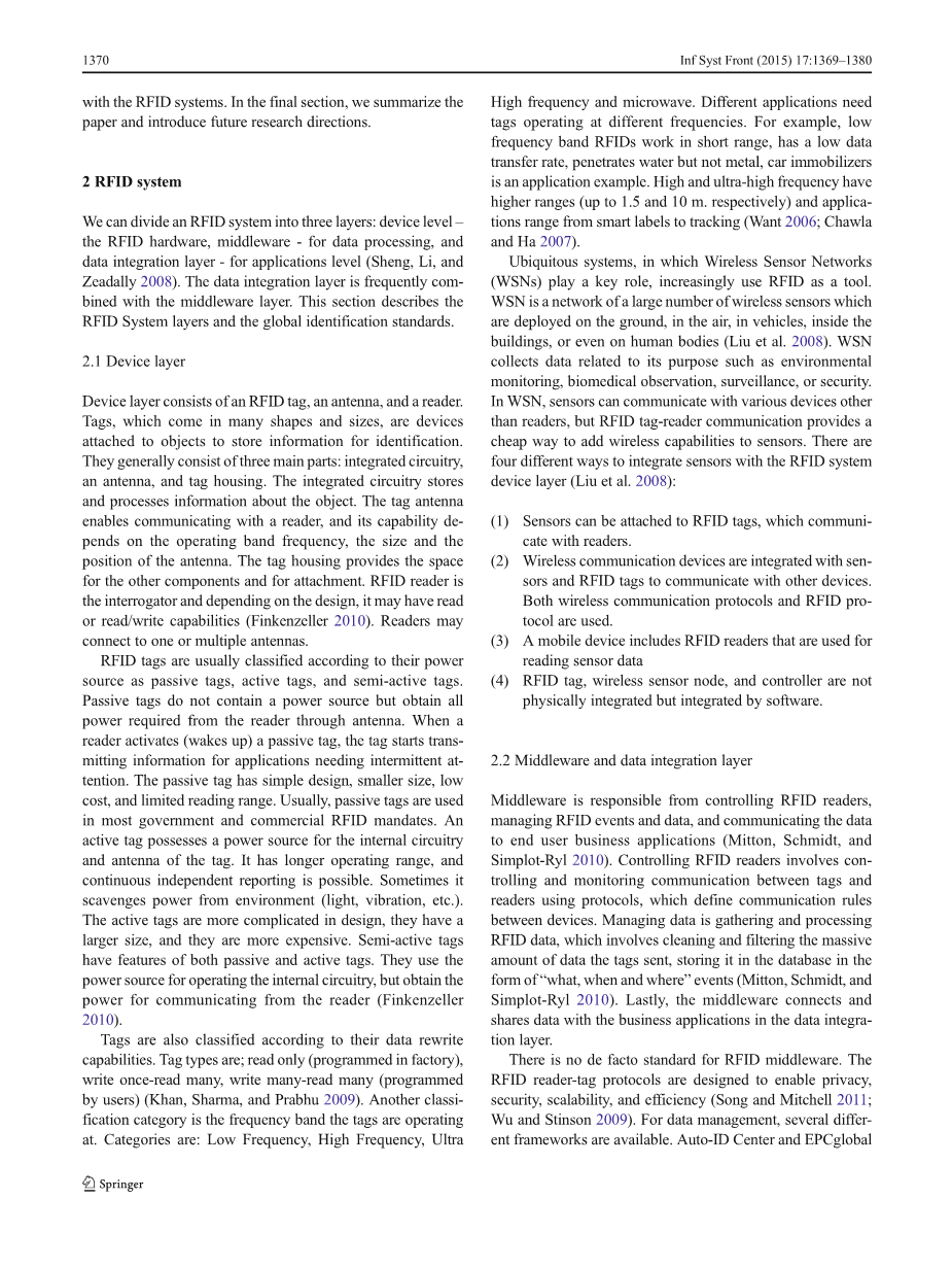 我们可以将RFID系统分为三层:设备层——RFID硬件,中间件——用于数据处理,数据集成层——应用程序级(Sheng, Li, and Zeadally 2008)。数据集成层经常与中间件层合并。本节介绍了RFID系统层和全球识别标准。