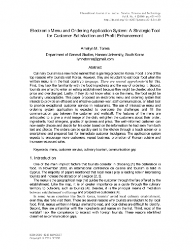 本文将首先讨论旅游业,特别是粮食支出对国家经济发展的贡献。从外国游客的角度解释了菜单的重要性。为什么游客不愿意尝试当地的食物。将介绍韩国的外国游客概况。将包括传统餐厅满意服务指标。最后,对提出的菜单和订购应用系统及其特点进行了讨论。