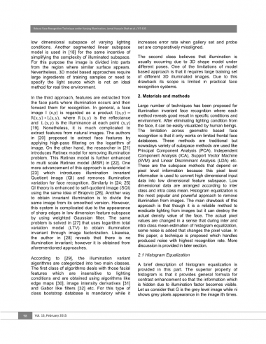类似地,在[12],作者试图通过利用具有各向异性扩散的低曲率图像简化器(LCIS)来消除照明。但是这种方法的缺点是需要手动选择少于8个多参数,因此其复杂性增加了。其次,即使使用这些全局处理技术,不均匀的光照变化也是非常棘手的。为了处理不均匀照明,使用基于区域的直方图均衡化(RHE) [9]和基于块的直方图均衡化(BHE) [13]。此外,他们的识别率远远高于从高等教育获得的结果。在[9]中,作者提出了一种称为商照明重新照明的方法,以使图像标准化。