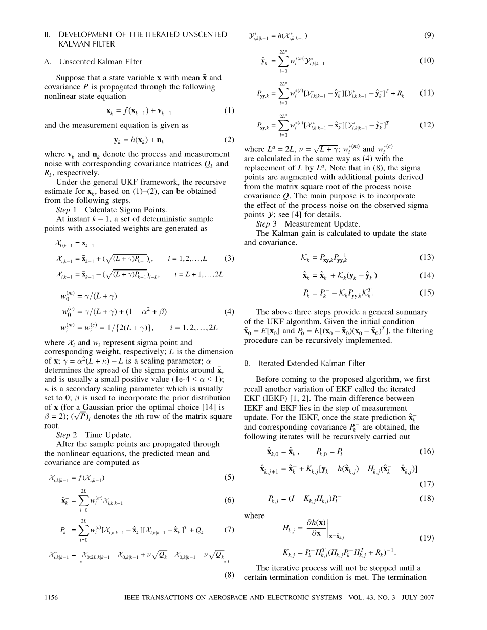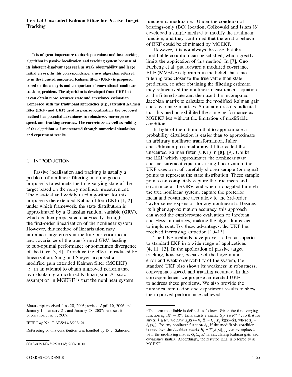 UKF方法已被证明在广泛的应用中远优于标准EKF [4,11,13]。然而,在被动目标跟踪的应用中,由于系统的初始误差较大且可观测性较差,标准的UKF也显示出它在稳定性,收敛速度和跟踪精度方面的弱点。在这个通信中,我们提出一个迭代的UKF来解决这些问题。我们还提供数值模拟和实验结果,以显示实现的改进性能。