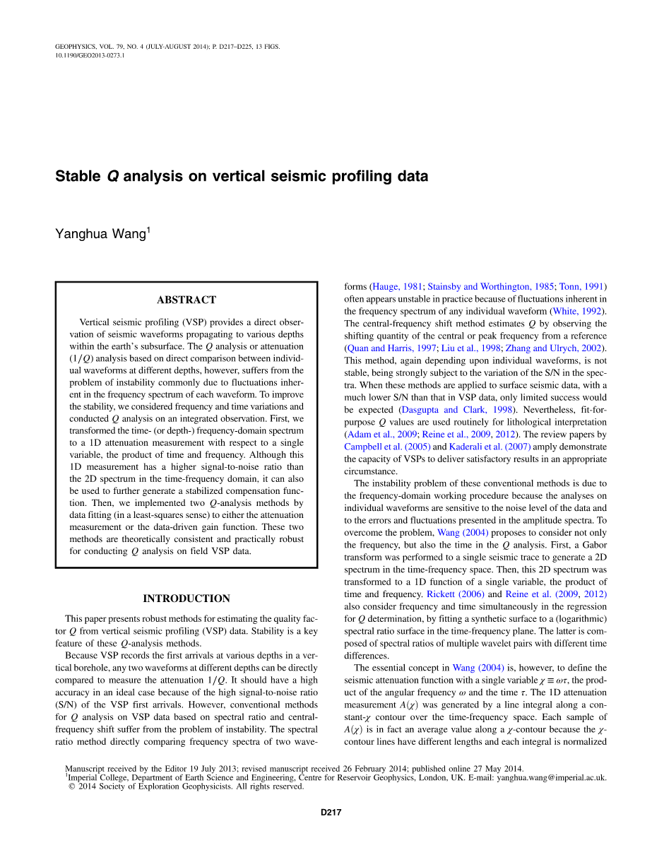 这一概念最初是针对地面地震数据的 Q 分析而开发的, 类似于反射地震信号处理中经常使用的速度分析 (王, 2004)。当前的每次尝试将此方法扩展到 VSP 首次到达的 Q 分析。考虑到不同深度的 VSP 第一到达波形与不同的第一到达时间相关联, 它们的叠加将使单个地震轨迹随时间变化。换句话说, 这些波形是一个时间域地震迹的完美分解。傅里叶变换的第一到达波形成一个由一个人产生的一系列频率谱、时间频率谱。王 (2004) 建议将这种时间频谱转换为1D 衰减测量的线积分。这种用于Q分析的是综合观测, 而不是个体波形的光谱。