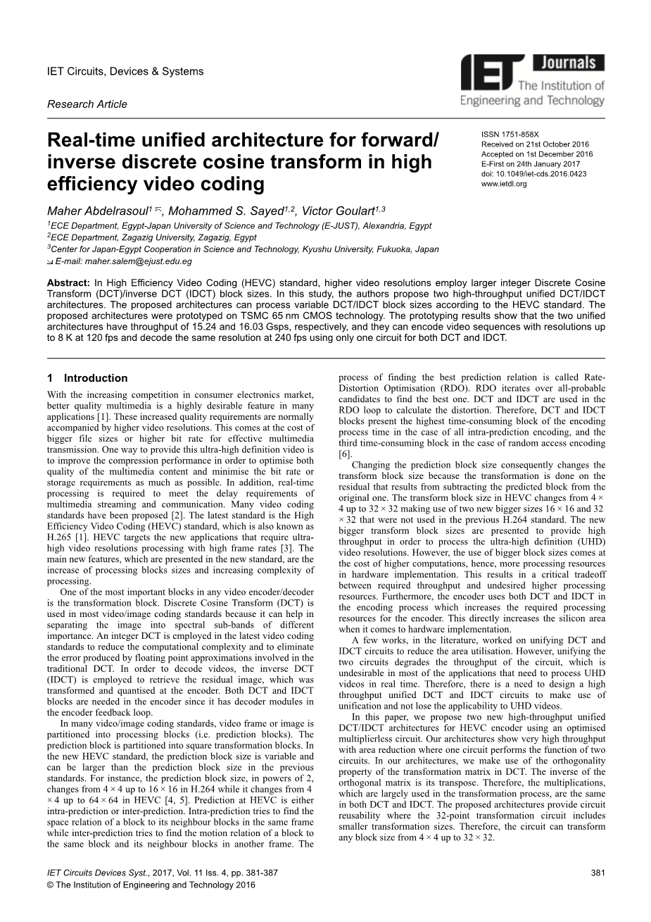 高效率视频编码中正向/反向离散余弦变换的实时统一架构