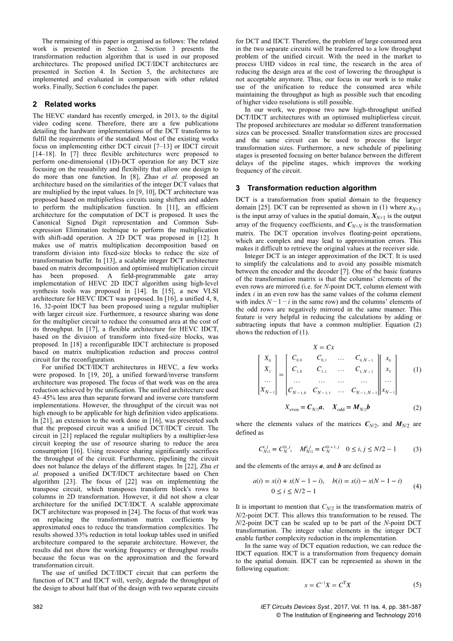 本文的其余内容分配如下:第2节介绍相关作品;第3节介绍我们在提出的体系结构中使用的简化转换算法;所提出的统一的DCT/IDCT体系结构将在第4节中介绍;第5节在与其他有关成果的比较下来实现和评估体系结构;最后,第6节使对这篇论文的总结。