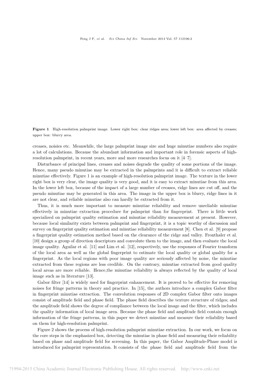 主线干扰,折痕和噪声降低了图像某些部分的质量。因此,许多伪细节可能被提取到掌纹中,并且难以有效提取可靠的细节。图1是一个高分辨率掌纹图像的例子。 右下角的纹理非常清晰,图像质量非常好,并且很容易从该区域提取细节。 在左下方的框中,由于大量折痕的影响,脊线被切断,并且在该区域可能会产生伪细节。 上方框中的图像模糊,其中的脊线不清晰,可靠的细节也难以从中提取出来。