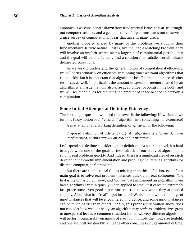让我们回到稳定匹配问题的例子。当稳定匹配输入实例的规模相对较小时,它定义的搜索空间却是巨大的(在n个男人和n个女人之间存在个可能的完美匹配)而我们需要找到一个稳定的匹配,关于这个问题的自然地“蛮力”算法是通过枚举艰难的进行所有的完美匹配,逐个检查,看看他是否稳定。在某种意义上,我们对匹配问题求解的令人吃惊的结果就是惊人巨大的可能性空间里,我们仅需要花费与N成比例的时间就可以找到一个稳定的匹配,这是我们在一个分析层次上得到的结论。我们并没有实现这个算法,也没有在样本优先表上来测验,而只是它进行数学推理。同时,我们的推理也指出,怎样可以在实践中实现这个算法,并且给出完全决定性的证据说明它比穷尽枚举有了更大的改进。