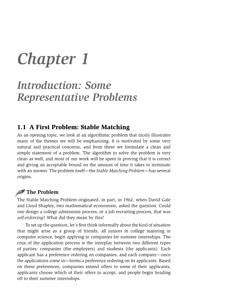 作为一个开始的主题,我们先看一个算法问题,这个问题对我们将要强调的许多问题做了很好的阐明。它来自一些非常自然的实际问题,从这些我们得到关于问题的清晰简洁的形式化陈述。解决这个问题的算法也非常的清晰,我们的主要工作就是证明它的正确性,并且对于为得到一个解决所占用的时间量给出一个可以接受的范围,这个问题—稳定匹配问题—有几个起源。