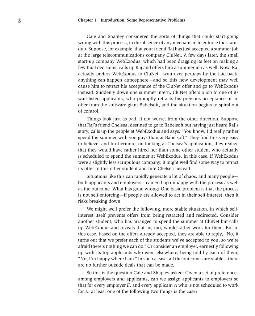 Gale和Shapley考虑了这种情况在缺少任何强制保持现状的机制下可能要出来的几类问题。假设,例如你的朋友Raj刚接受了一个大电信公司CluNet的暑假工作。一个小的创业公司WebExodus,它做了最后的决策时慢了几步,几天后它也打电话给Raj,也给了他一个暑假的工作。现在,也许是由于这种随意的什么都能做的氛围的吸引,Raj实际上更愿意去WebExodus而不是CluNet。于是这个新的发展也可能使他取消接受CluNet的录用,而去WebExodus。由于突然少了一个暑假实习者,因此CluNet向待聘的一个申请人提供一项工作,这个人马上取消他早先从一家软件巨人Babelsoft接受的录用,那么情况开始连续失控。