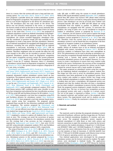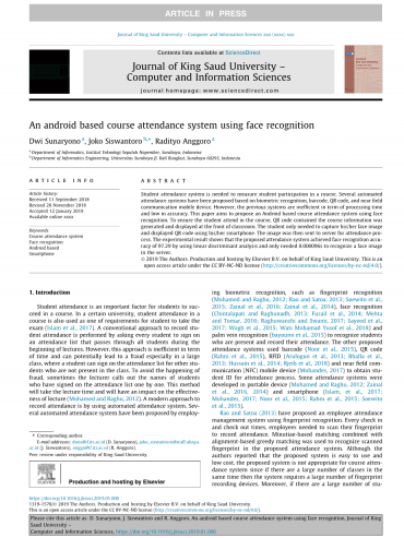 学生出勤是学生在课程中取得成功的重要因素,在一些大学里面,学生上课的出勤率决定着他能否参加本门课的考试。记录学生出勤率的传统方法是通过要求每个学生在课程开始时通过所有学生的出勤列表进行签名来进行,然而,这种方法浪费时间并且可能导致欺诈,特别是在选课人数较多的班级中,学生可以在课堂上为其他没有上课的学生签名。为了避免发生欺诈,有时讲师会一个接一个地在选课名单上念出学生的名字。这种方法占用讲座时间并对讲课的效果产生影响。如今,一般通过使用自动考勤系统来记录出勤率。一些自动化考勤系统基于生物识别,例如如指纹识别(Mohamed和Raghu,2012年; Rao和Satoa,2013年; Soewito等人,2015年; Zainal等,2016; Zainal等,2014)面部识别(Chintalapati和Raghunadh,2013年; Fuzail等,2014;梅塔和Tomar,2016年; 2017年Raghuwanshi和斯瓦米; Sayeed等人,2017; Wagh等,2015; Wati Mohamad Yusof等,2018年)和掌纹识别(bayoumi 等,2015)来识别学生谁在场并记录他们的出勤率。另一个考勤系统提议使用条形码(Noor等,2015),QR码(Rahni等,2015),RFID(Arulogun等,2013; Bhalla等,2013; Hussain等,2014; Rjeib等,2018)和近场通信(NFC)移动设备(Mohandes,2017)获得学生出勤过程的ID。一些出勤系统使用便携式设备(Mohamed和Raghu,2012; Zainal等,2016,2014)和智能手机(Islam,等。2017; Mohandes,2017; Noor等,2015; Rahni等,2015; Soewitoet)开发2015。