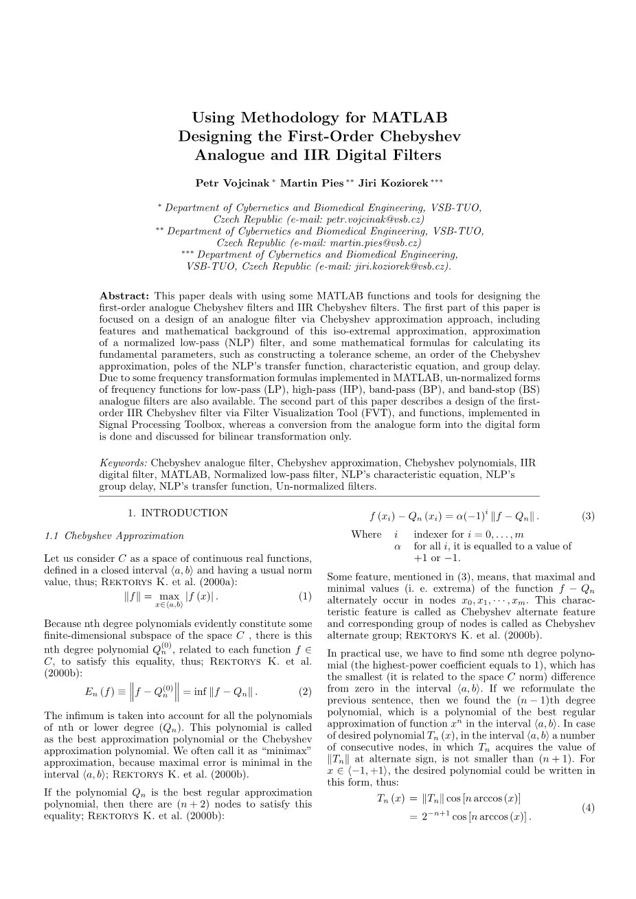 摘要:本文利用MATLAB函数和工具为一阶模拟切比雪夫滤波器和IIR切比雪夫滤波器的设计。本文的第一部分的重点是通过切比雪夫逼近方法的模拟滤波器的设计,包括特点和本ISO极值逼近的数学背景,一个归一化低通滤波器逼近(NLP),并对其基本参数计算一些数学公式,如构建容错方案的切比雪夫逼近的顺序,对NLP的传递函数极点特征方程,和群延迟。由于一些频率变换公式在MATLAB中实现,非归一化频率函数形式的低通(LP)、高通(HP),带通(BP),和带阻(BS)模拟滤波器也可。本文的第二部分描述了一个一阶IIR切比雪夫滤波器设计的滤波器的可视化工具(FVT)和功能,在信号处理工具箱来实现的,而从模拟形式转换为数字形式只做了双线性变换。