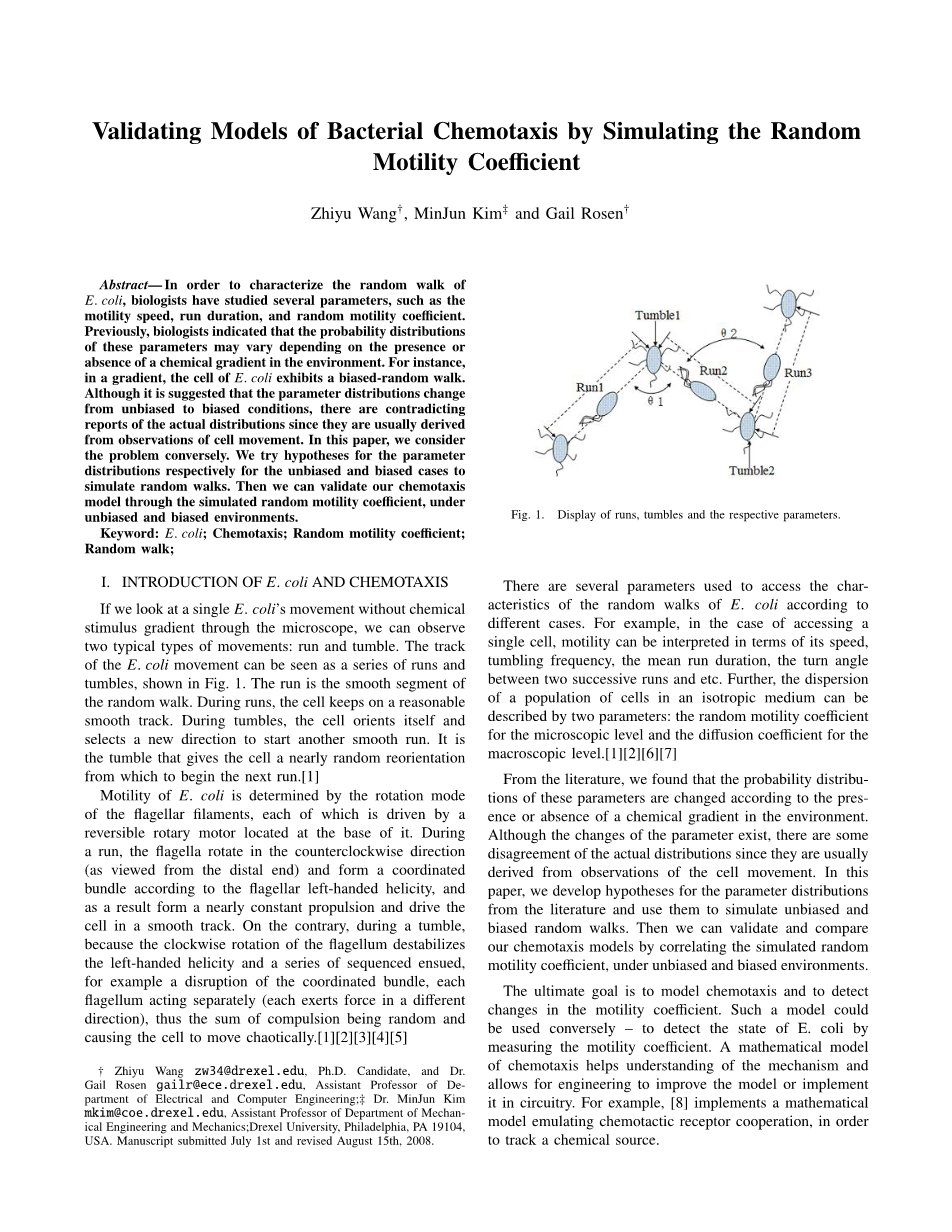 关键词 E:杆菌;趋化性;随机运动系数;随机行走;